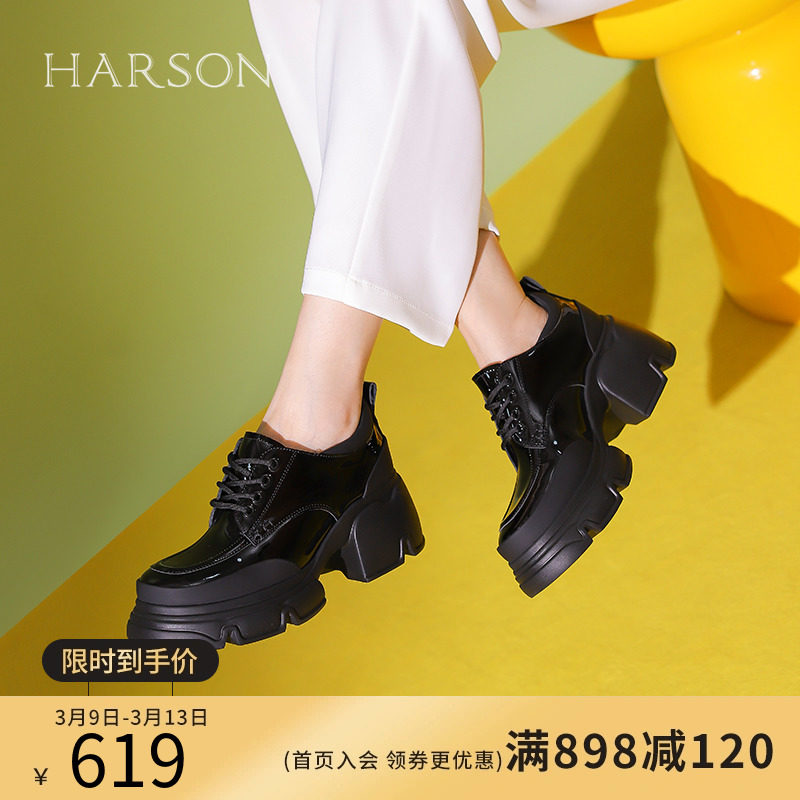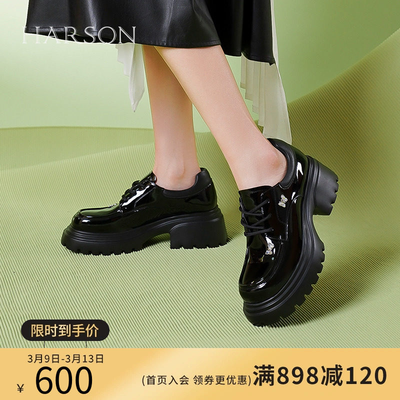 哈森深口单鞋女2024新款休闲厚底漆皮系带小皮鞋小个子HWS240200