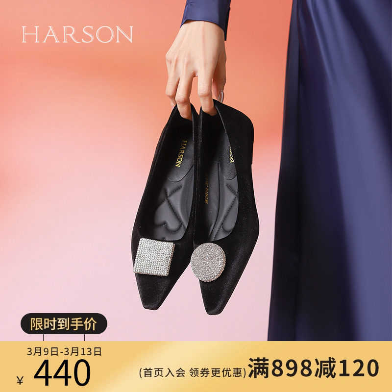 哈森HARSON正品2023春秋季中粗跟尖头通勤百搭水钻女单鞋HS237905