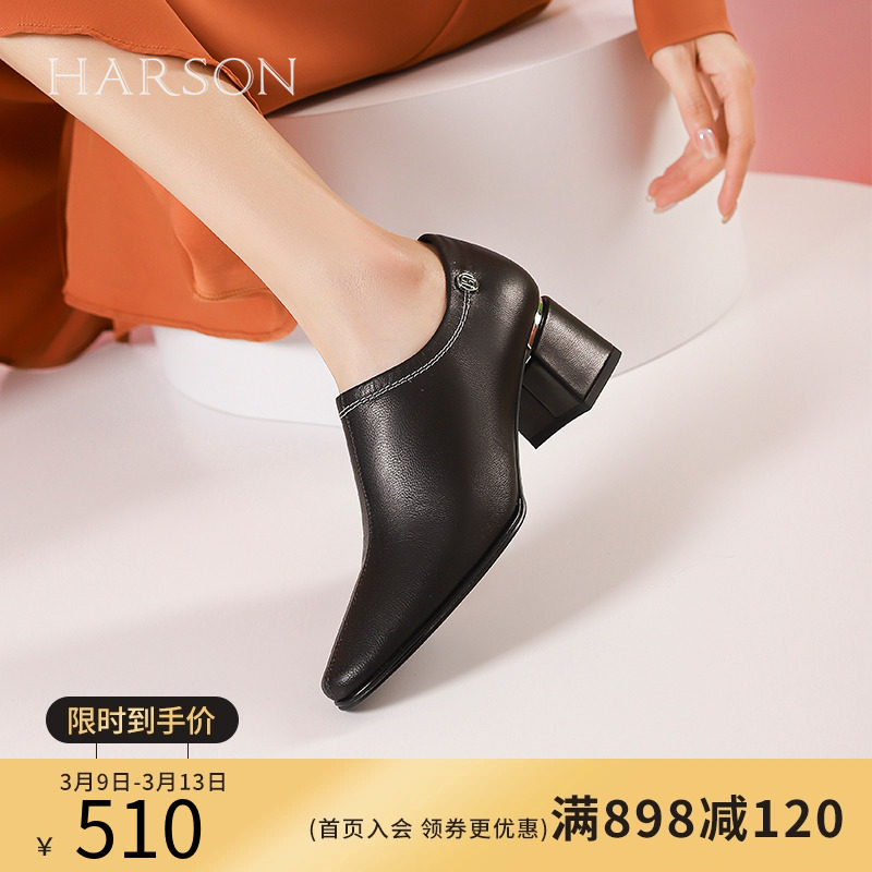 哈森秋季新品方头粗跟一脚蹬皮鞋中跟通勤百搭单鞋HWL230110