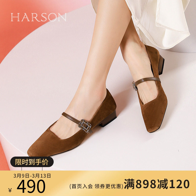 哈森玛丽珍女鞋2024春季新款方头知性羊反绒粗跟单鞋HWS240130