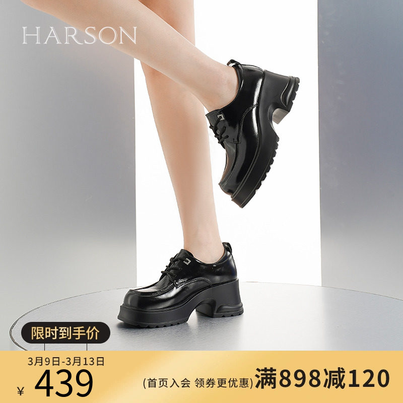 哈森小皮鞋女2024春季新款学院风系带厚底粗跟深口单鞋HS242513