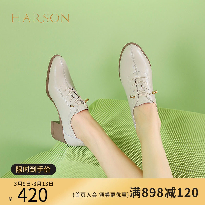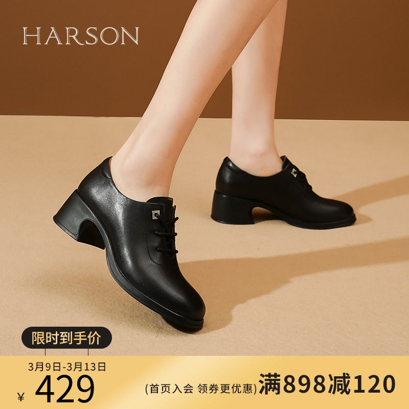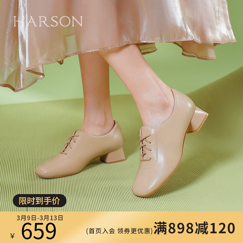 哈森春季新款小皮鞋女粗跟系带高跟鞋通勤软皮深口单鞋HL237127