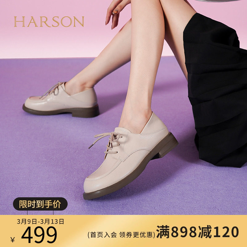 哈森2024年春季新品系带小皮鞋深口单鞋乐福鞋复古百搭HS240701