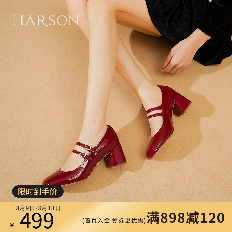 哈森单鞋女春季新款粗跟工作高跟鞋法式玛丽珍鞋小皮鞋HWS230186