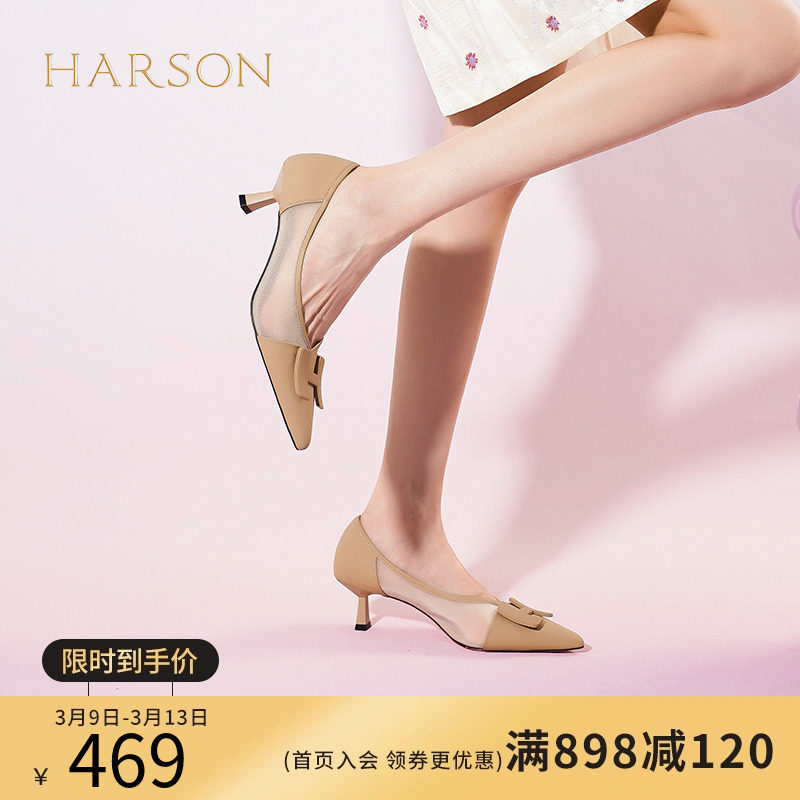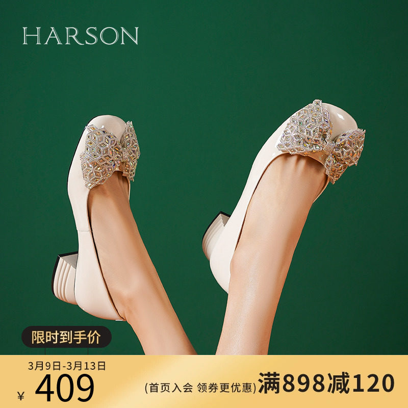 哈森HARSON正品春秋季粗高跟尖头HL227917蝴蝶结女单皮鞋HL237925