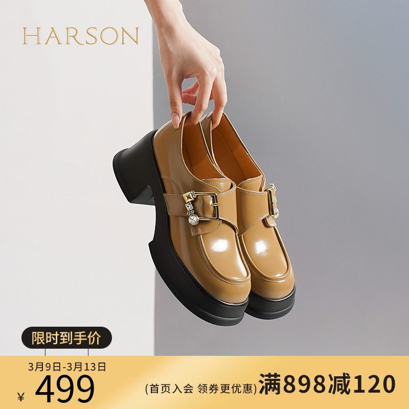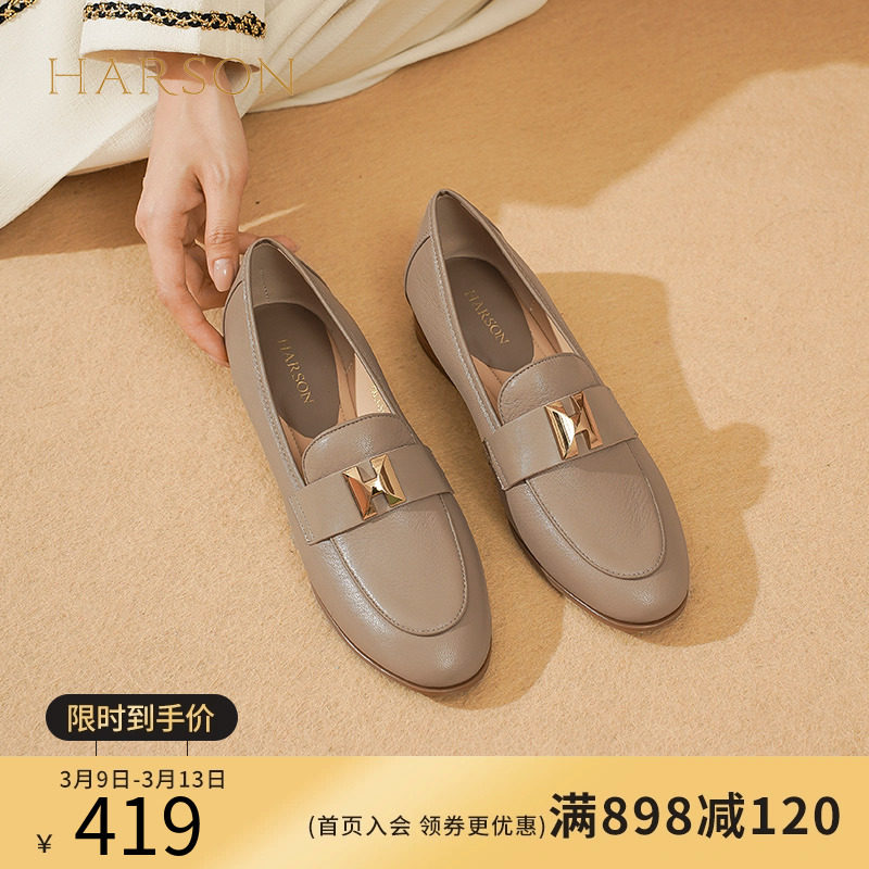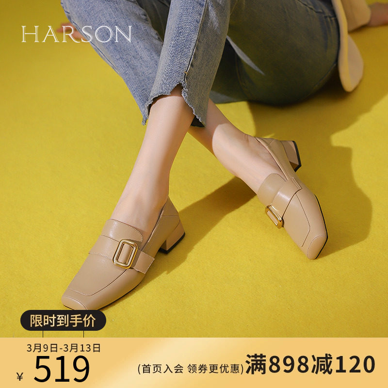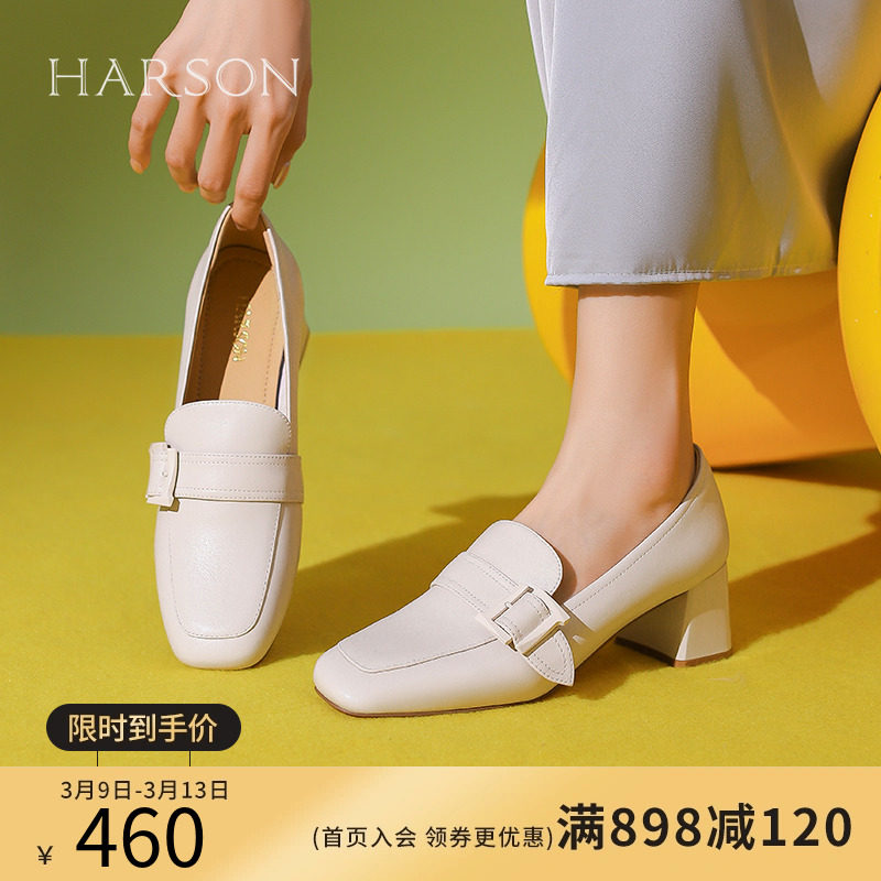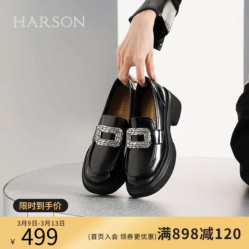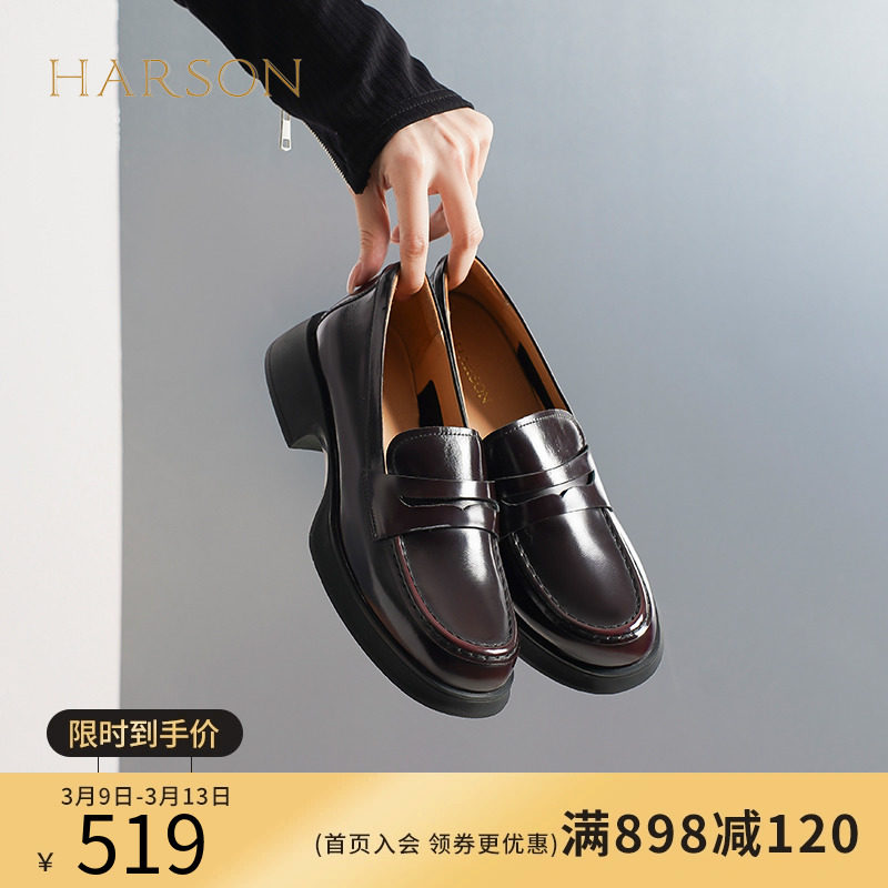 哈森HARSON正品2023新款春秋季高方跟圆头乐福女单皮鞋HL232503