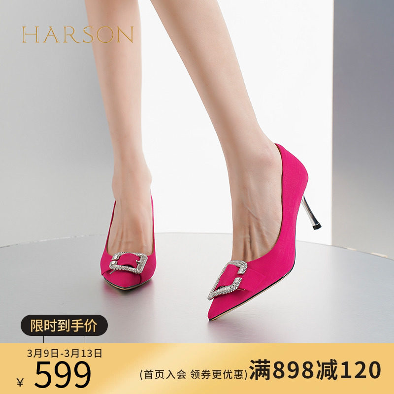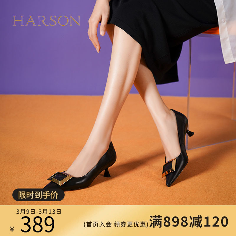 哈森秋季新款时尚方扣通勤小皮鞋尖头细跟浅口单鞋HWS230206