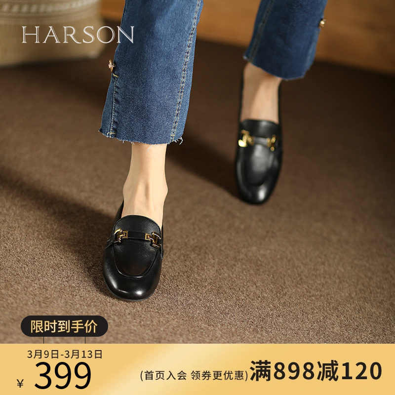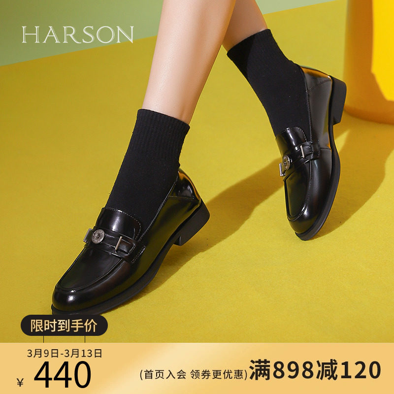哈森HARSON正品2023新款春秋季方跟圆头乐福百搭女单皮鞋HL237701