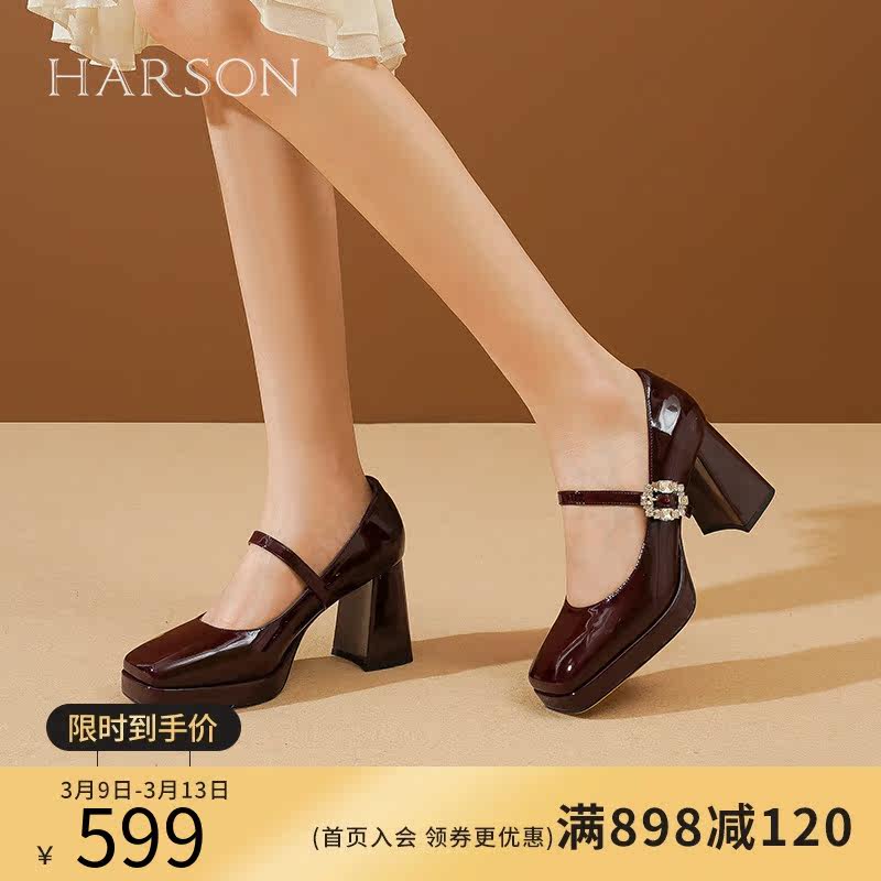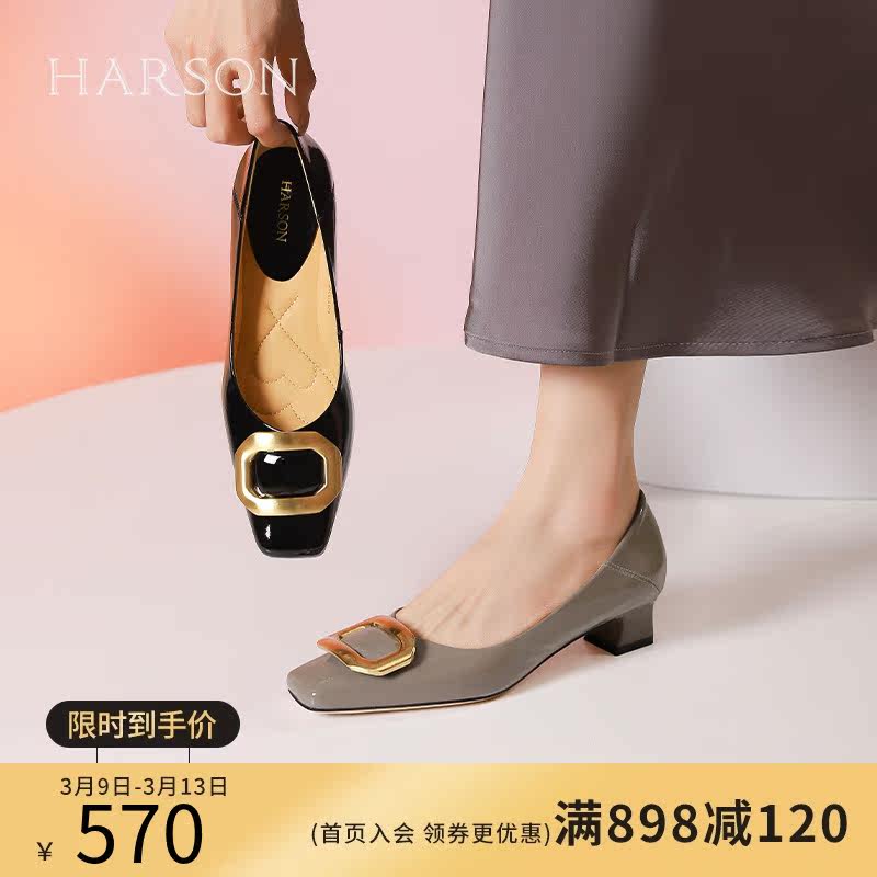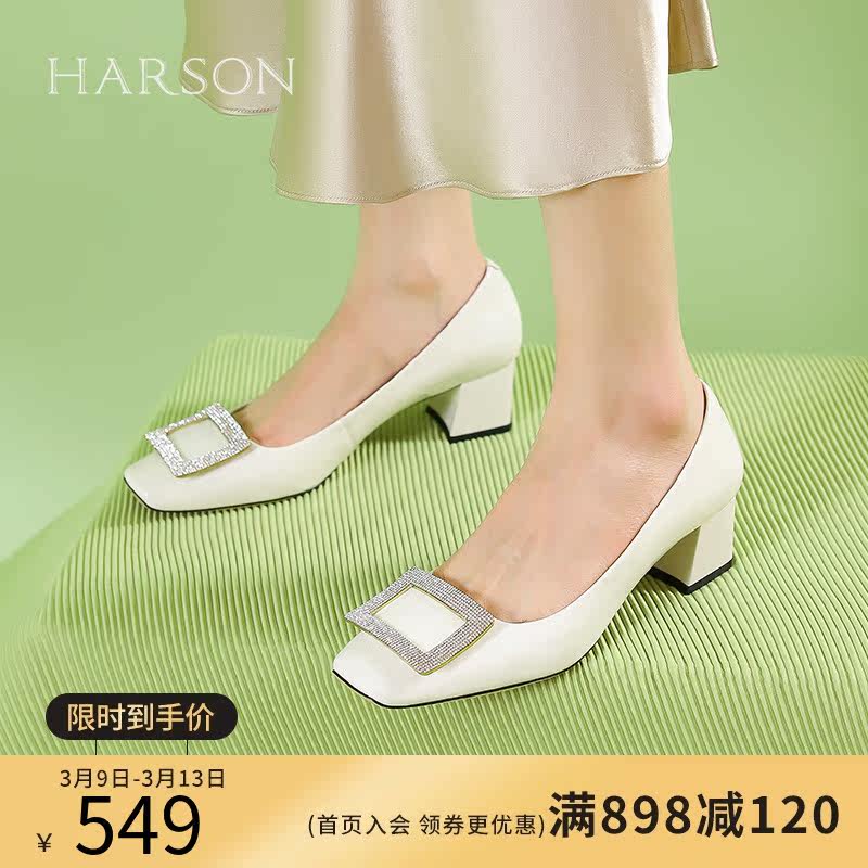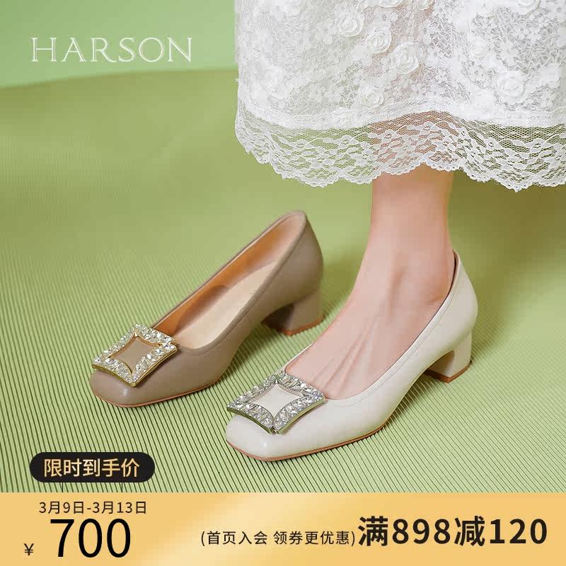 哈森单鞋女2024春季新款羊皮革方头水钻方扣粗跟小皮鞋HWS240131