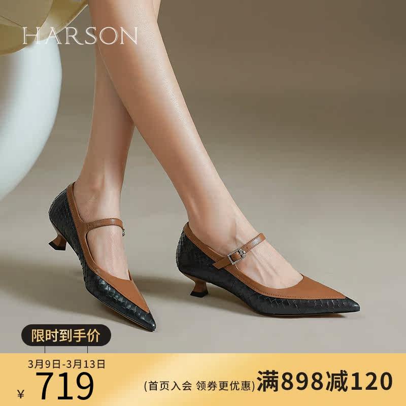 哈森玛丽珍鞋女秋季新品尖头细跟拼接皮鞋浅口单鞋HWL230128