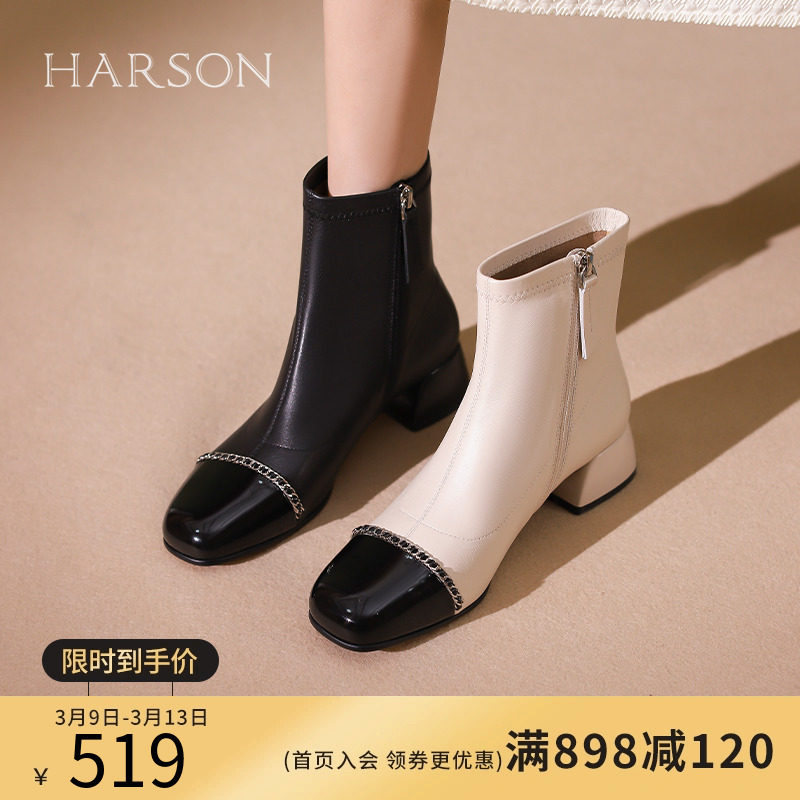 哈森2023冬季新款拼色时装靴拉链便捷通勤短靴皮鞋女HWA230143