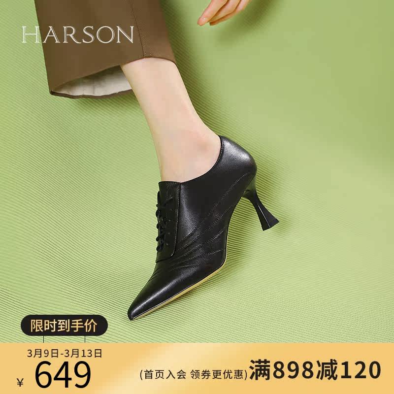 哈森春季新款小皮鞋女粗跟系带高跟鞋通勤软皮深口单鞋HL237127