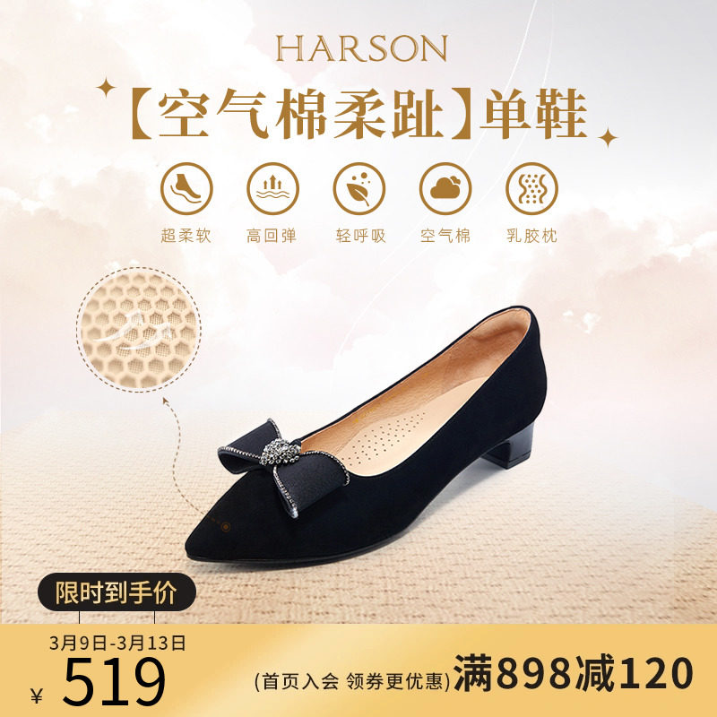 哈森秋季新品尖头蝴蝶结羊反绒单鞋女皮鞋粗跟工作鞋HS237912