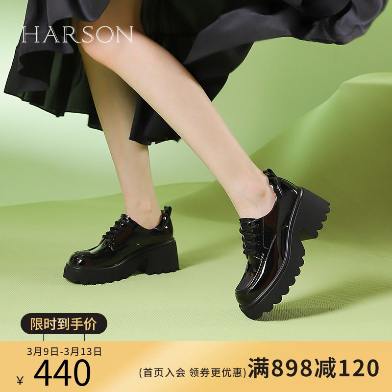 哈森亮面小皮鞋女春季新款系带厚底深口单鞋jk学院风女鞋HL232505