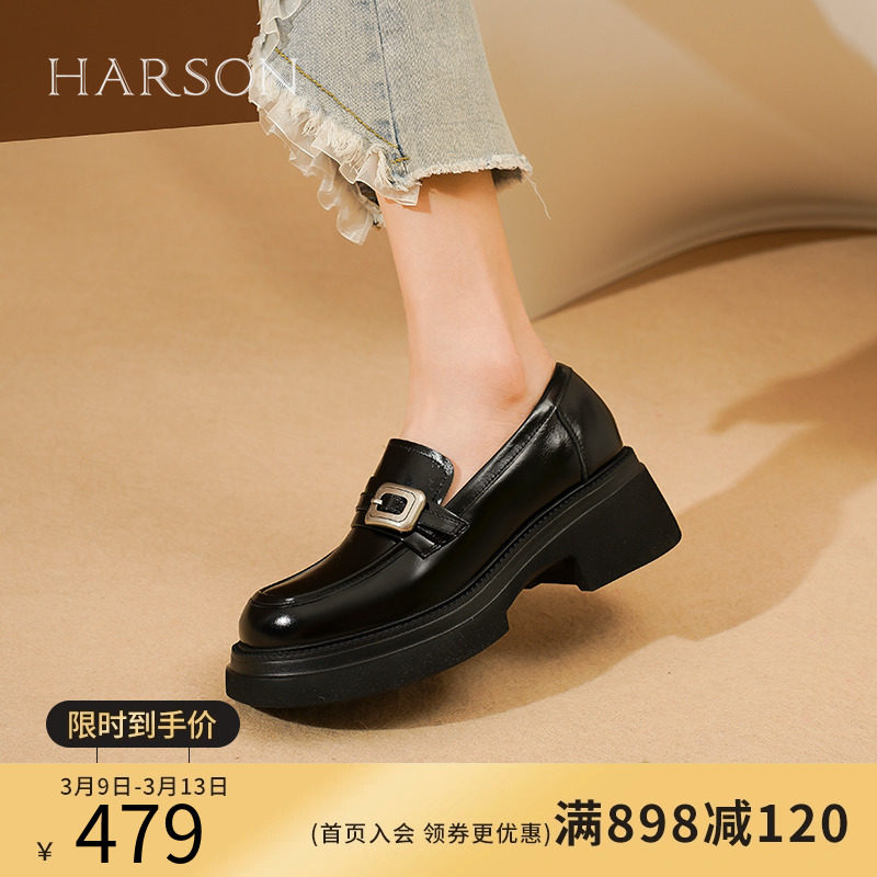 哈森HARSON正品2024新款春秋季轻质增高厚底女乐福单皮鞋HS242513