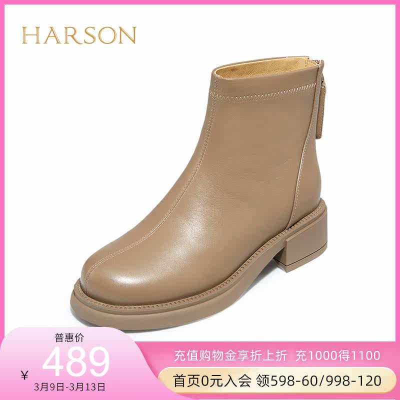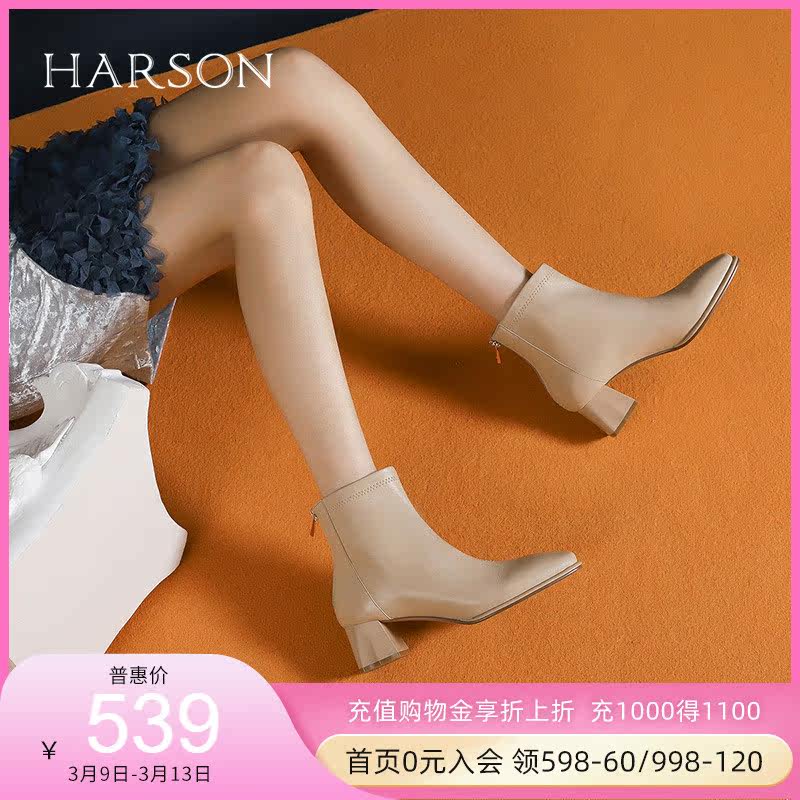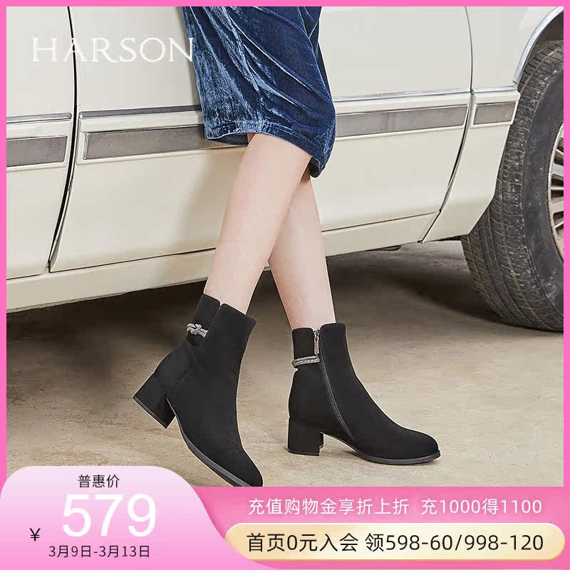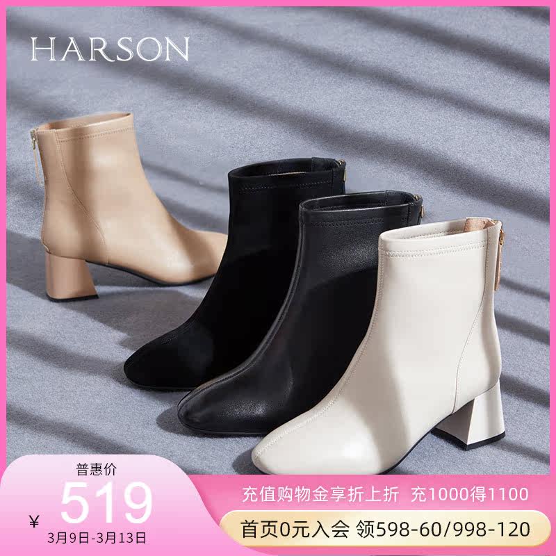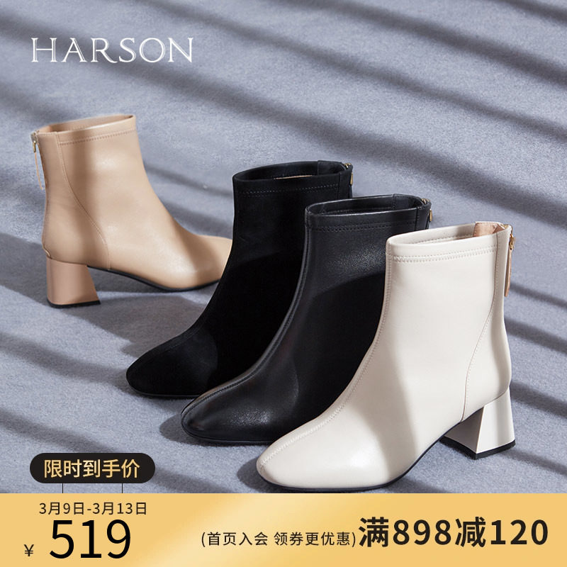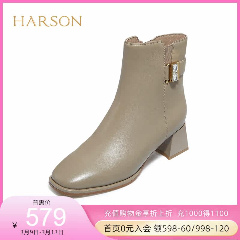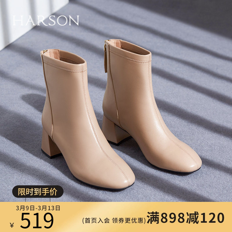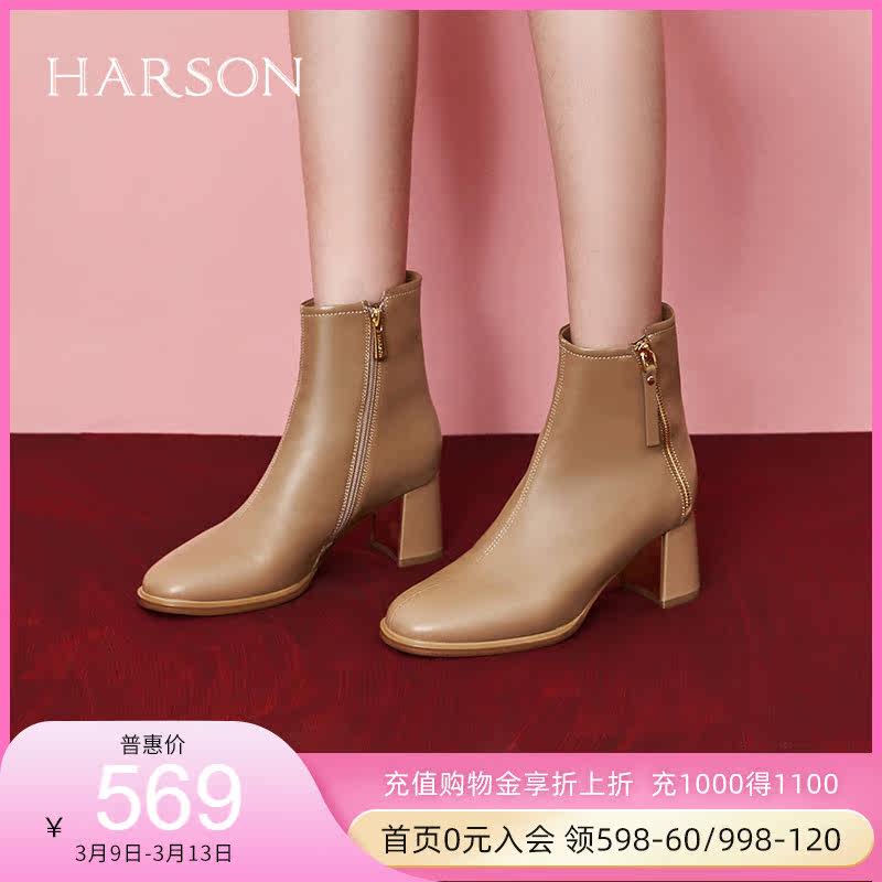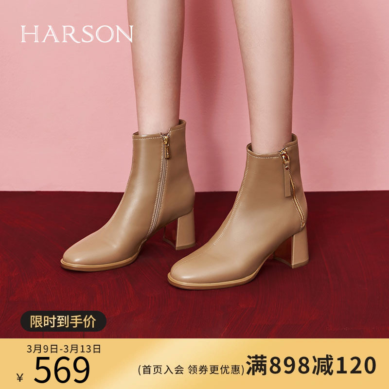 HARSON哈森女鞋专柜正品2021冬新款粗跟后拉链女短筒靴子HA17192
