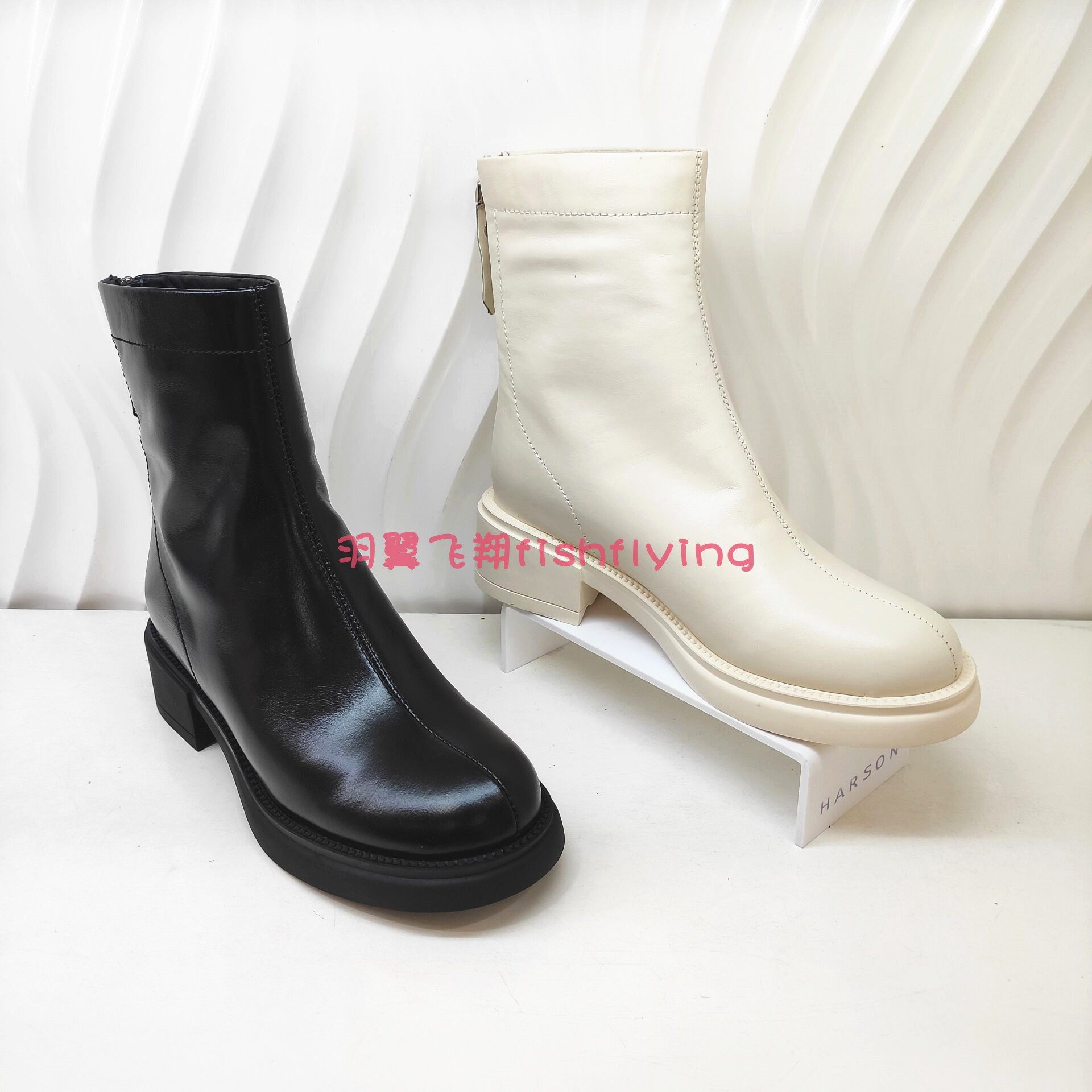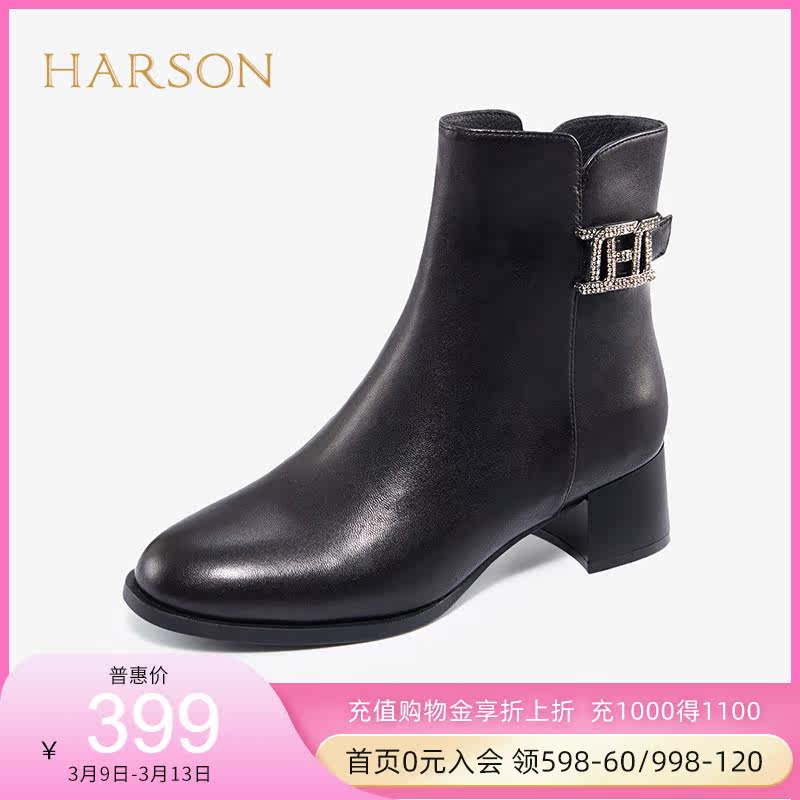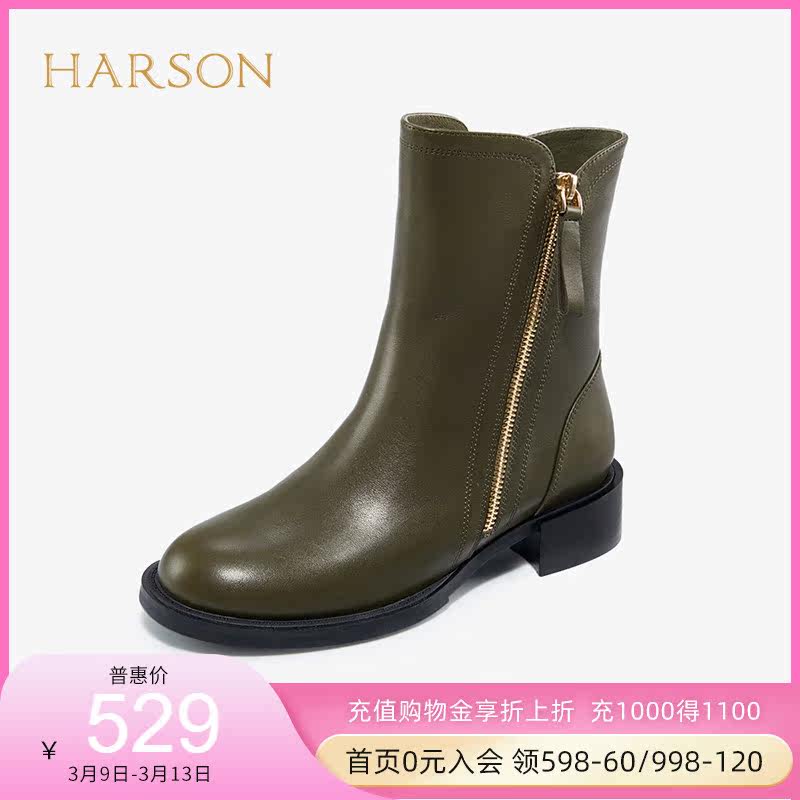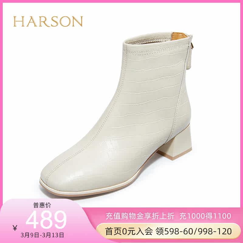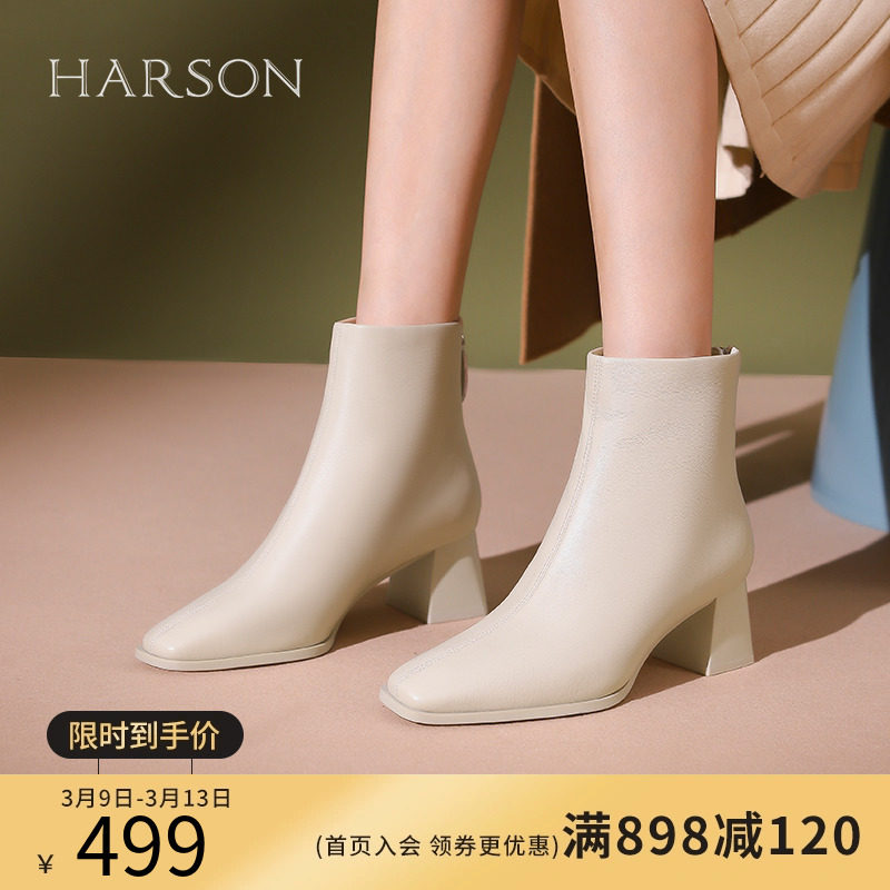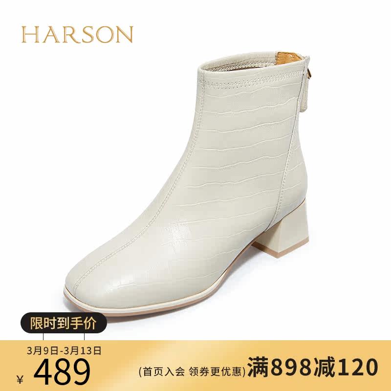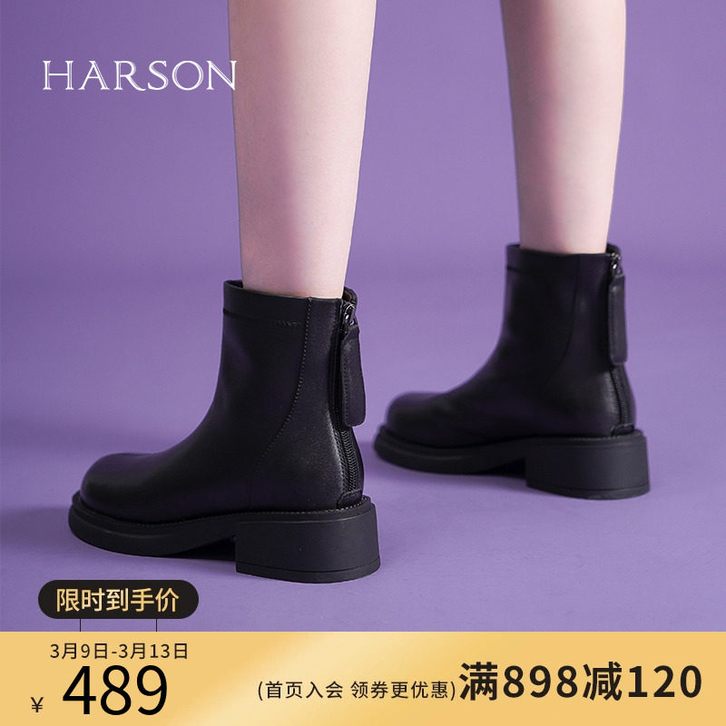 HARSON哈森女鞋专柜正品2021冬新款粗跟后拉链女短筒靴子HA17192