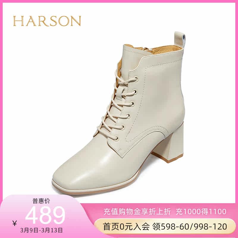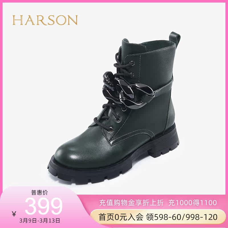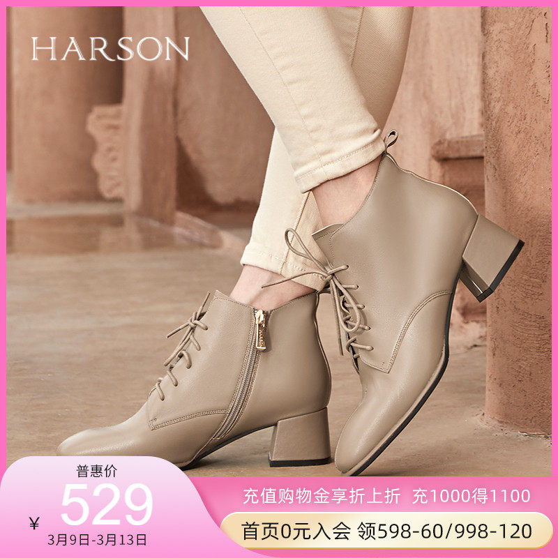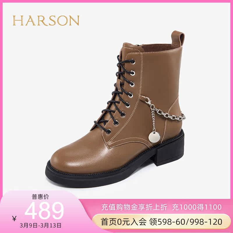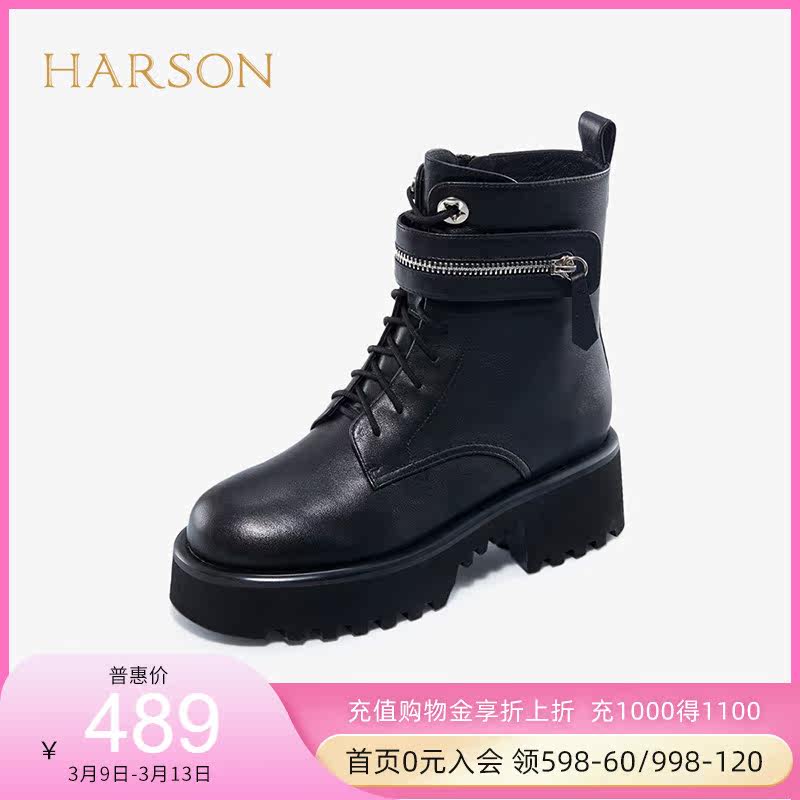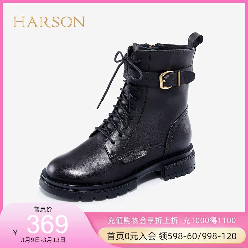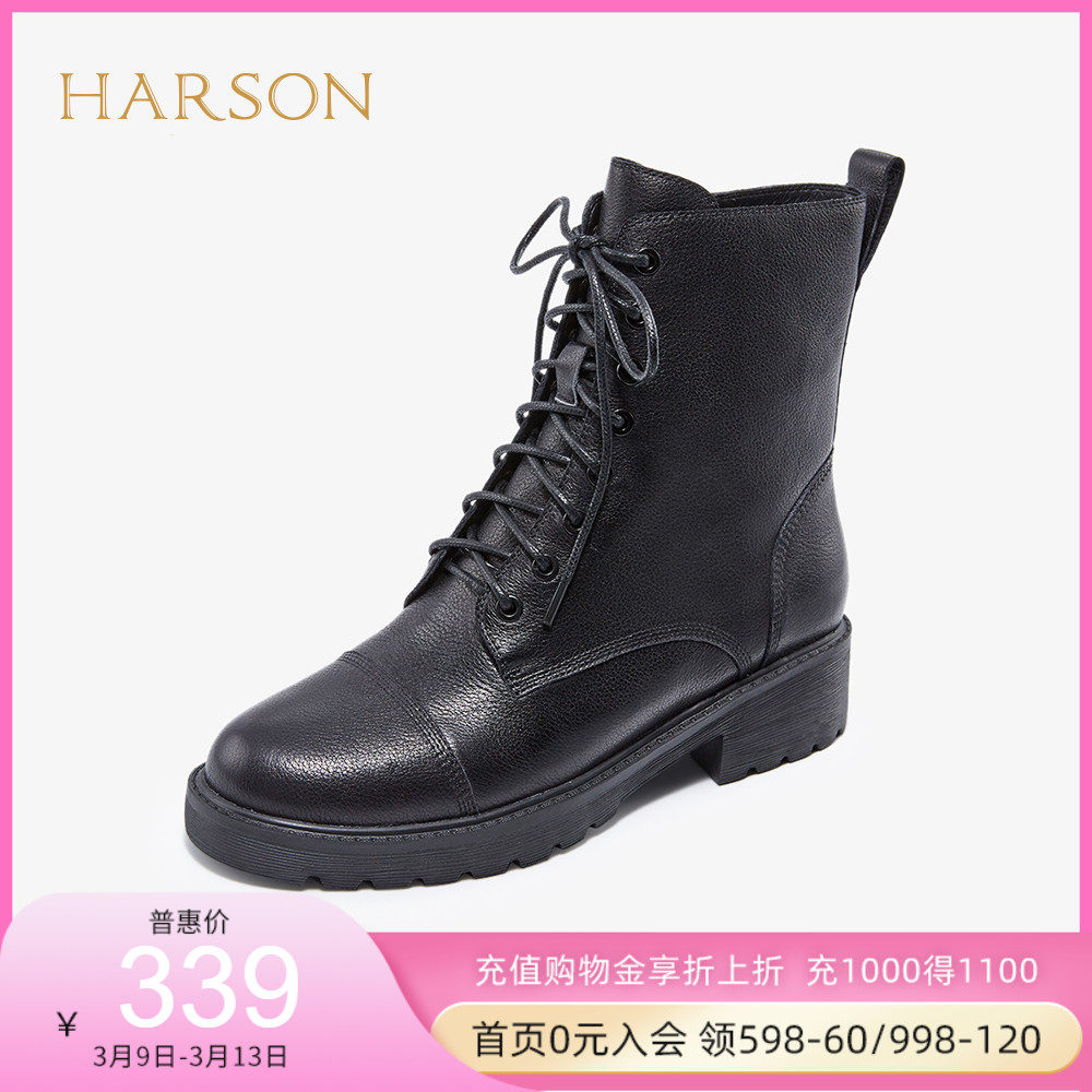 断码特惠哈森HARSON正品冬季高粗跟系带英伦马丁女皮靴子HA229201