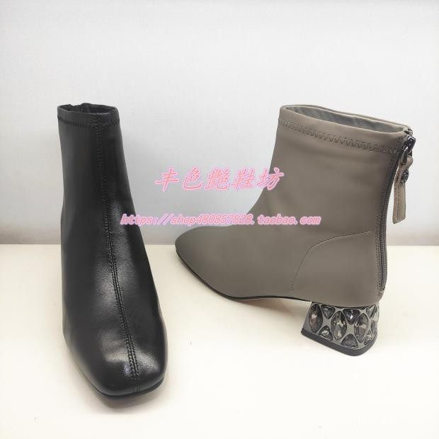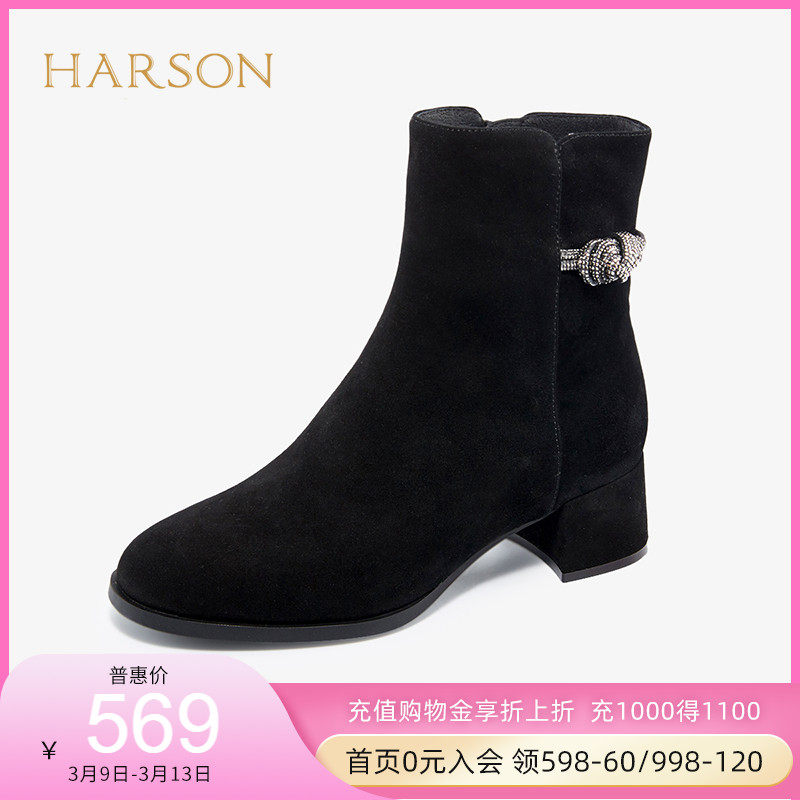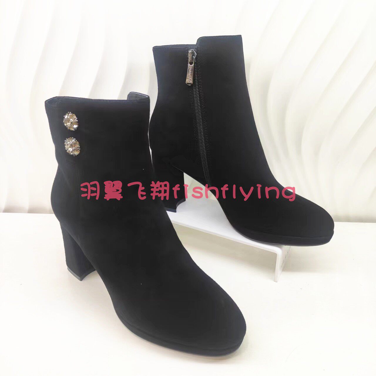 专柜正品Harson/哈森2021冬款水钻侧拉链粗跟高跟女短靴子HA17111