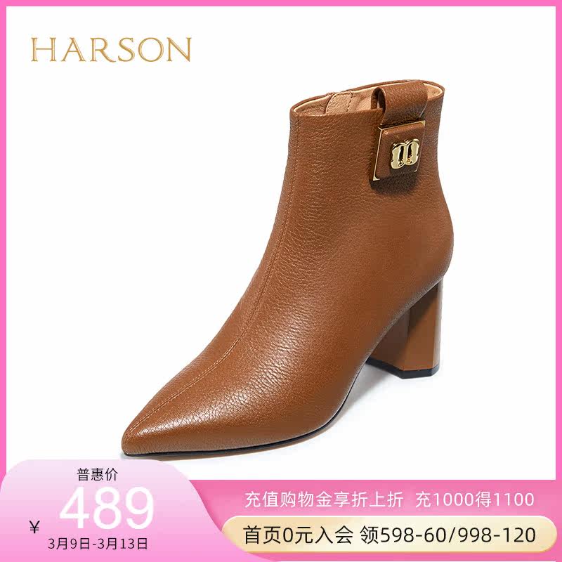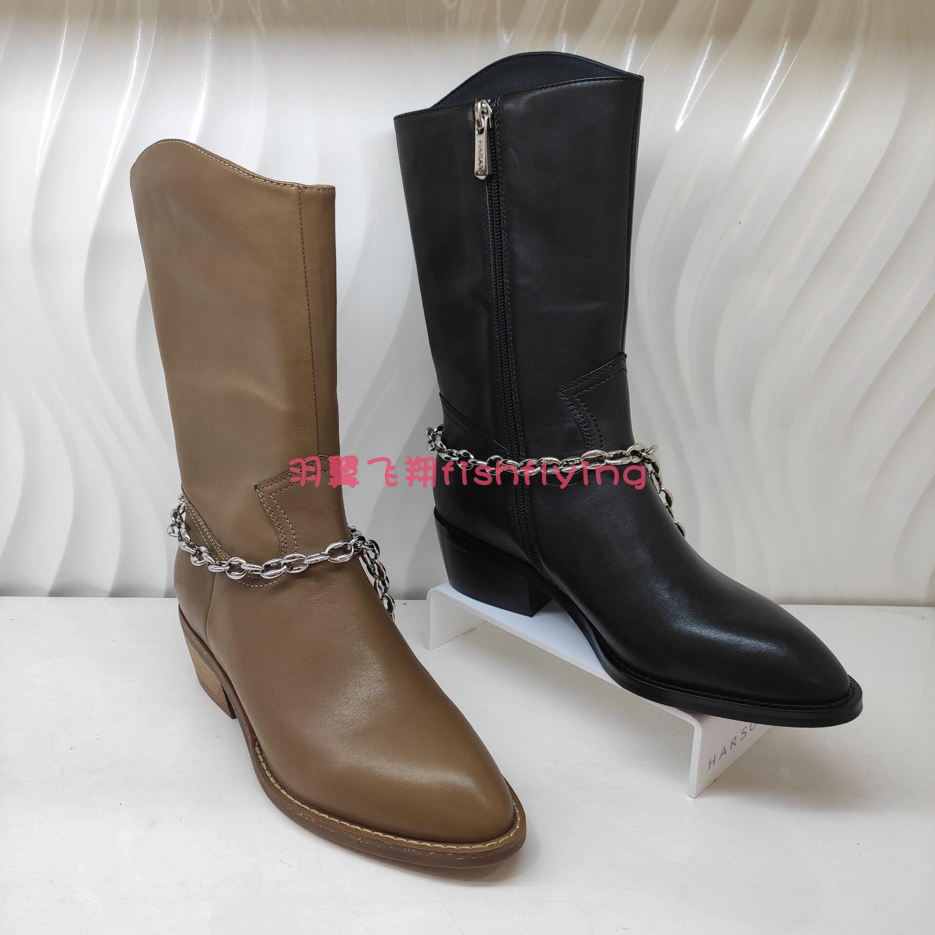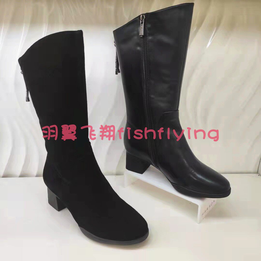 专柜正品Harson/哈森2021冬新款粗跟尖头牛皮中筒女靴子HA19208