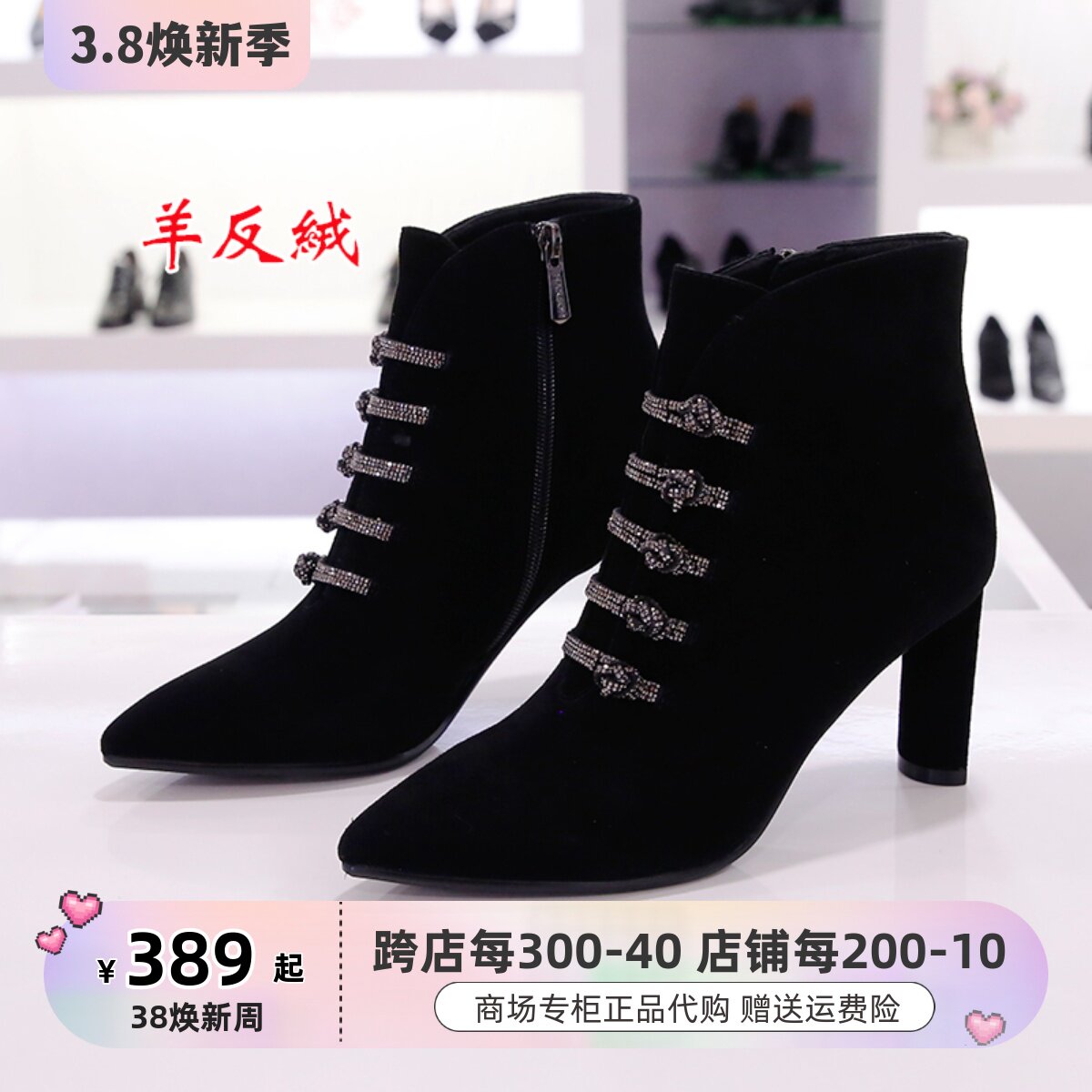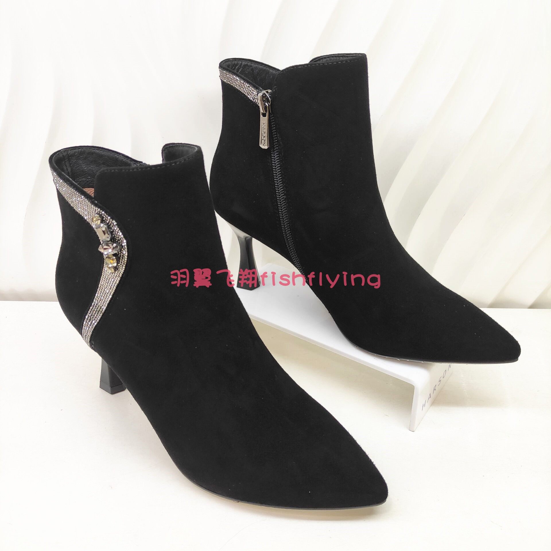 哈森靴子女新款法式水钻羊反绒尖头细高跟短靴女秋冬HA226608