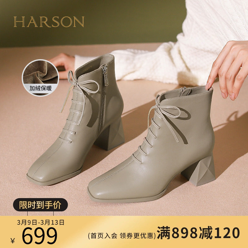 哈森新款方头时装靴优雅系带短靴女粗跟短筒女靴子HA222531