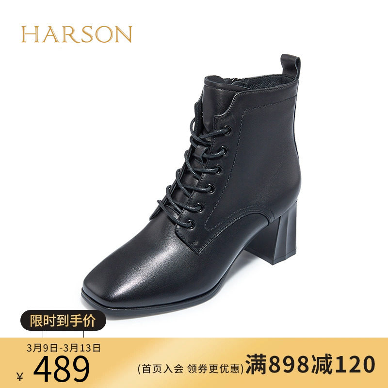 哈森羊皮单靴方头时装靴优雅系带短靴女粗跟短筒女靴子HA222531