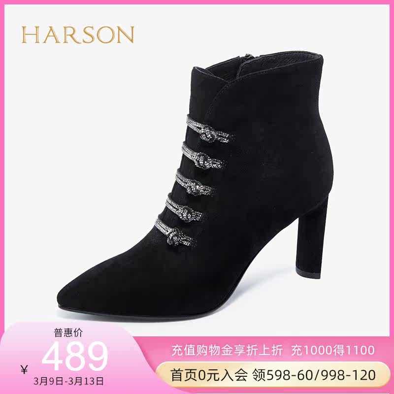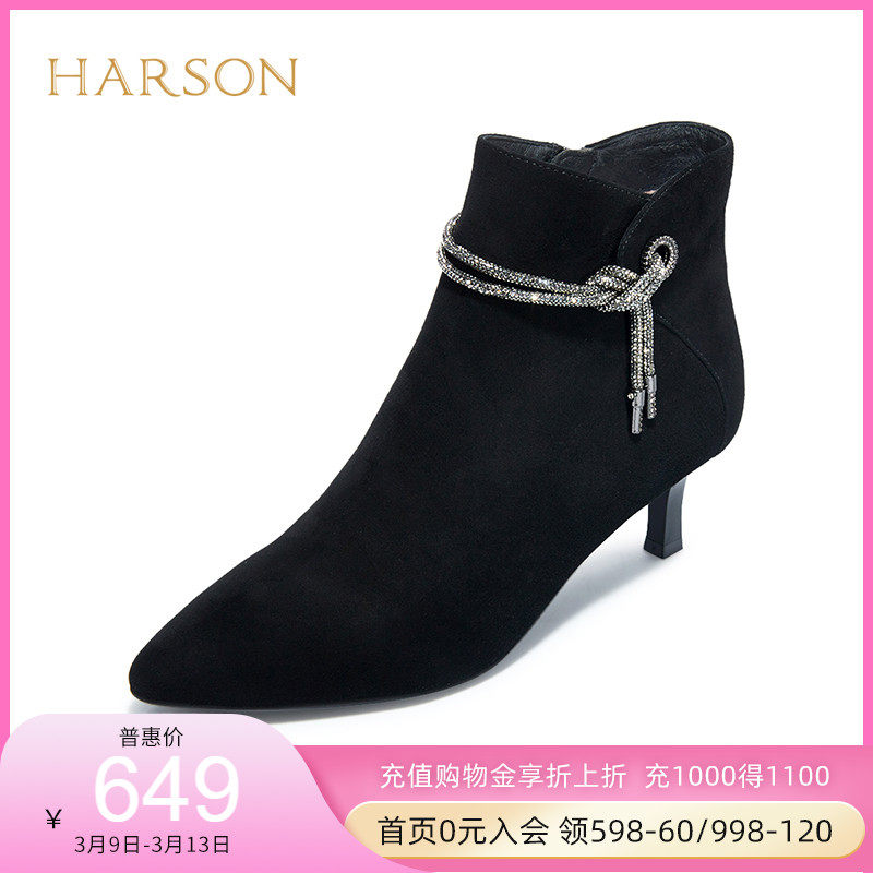 Harson哈森女鞋短靴2023新款冬季靴子水钻高跟尖头反毛皮HA236006