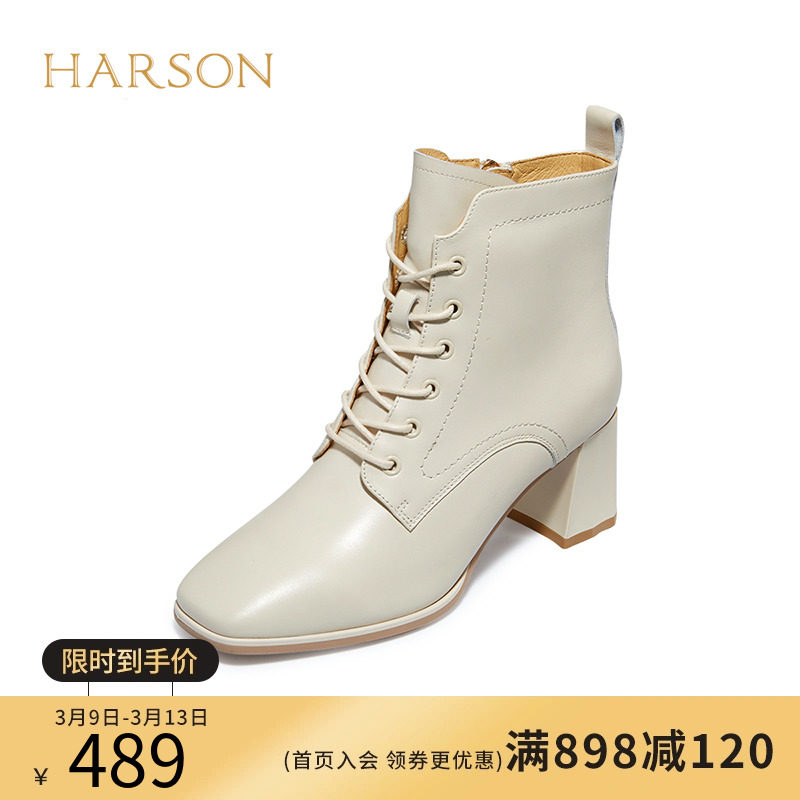 哈森靴子女新款方头粗跟时装短靴白色奶油靴秋冬单靴HA228801