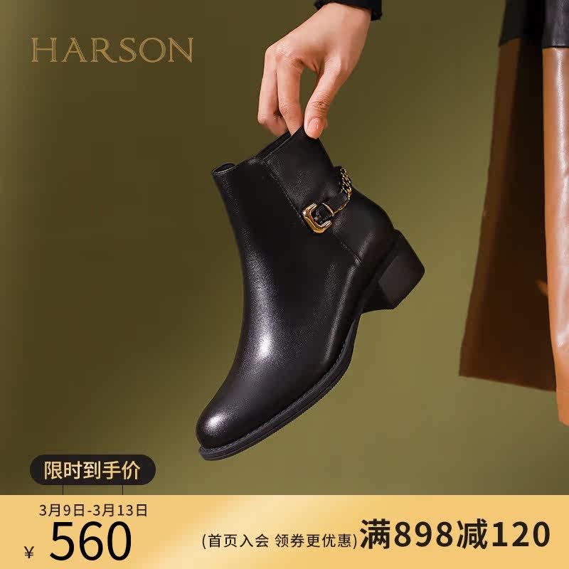 哈森HARSON女鞋专柜正品2022冬新款粗跟方头时装女短靴子HA227107