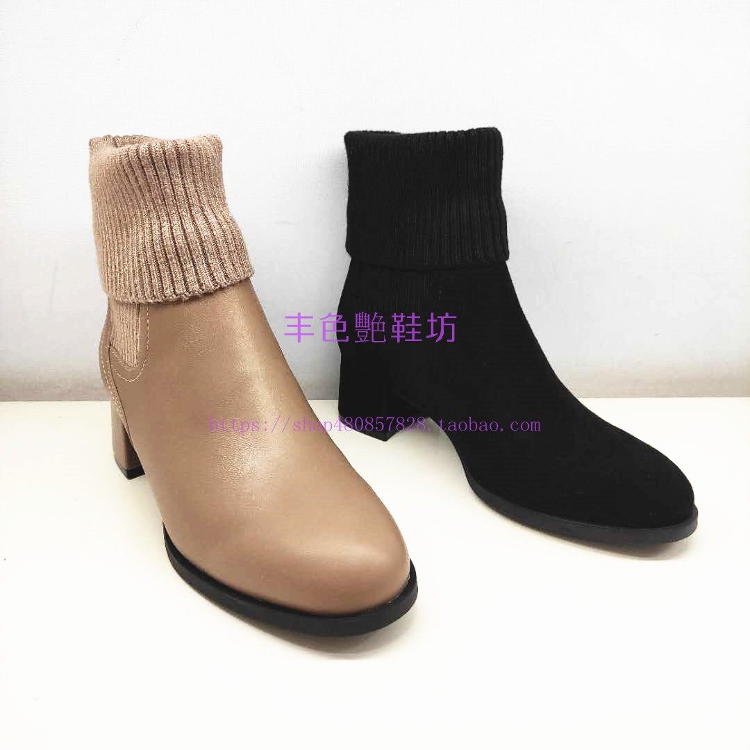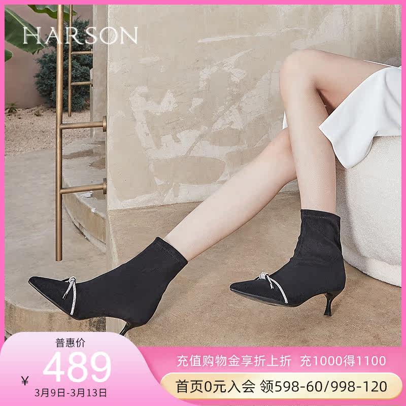 哈森秋季新款女短靴高跟鞋细跟百搭袜靴尖头套脚瘦瘦靴子 HA16012