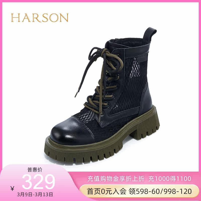 哈森冬季新款时尚休闲方跟透气网纱马丁靴子夏款凉靴HA222507