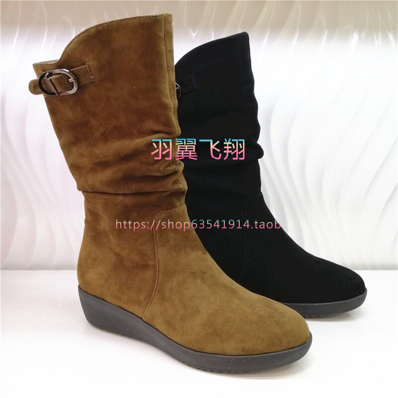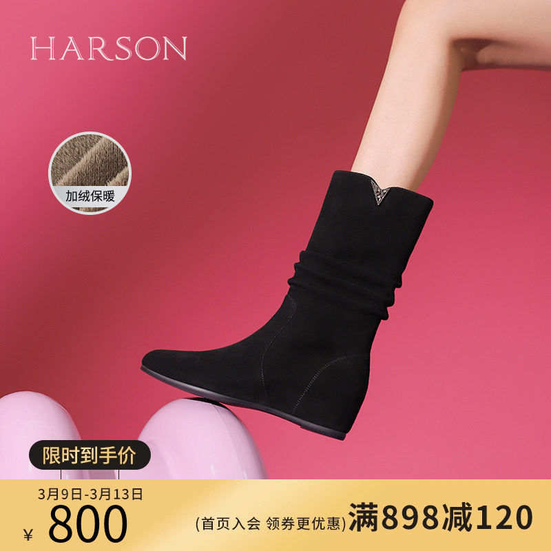 哈森专柜正品20冬新款翻皮圆头坡跟中筒超轻底女中筒靴子HA83409