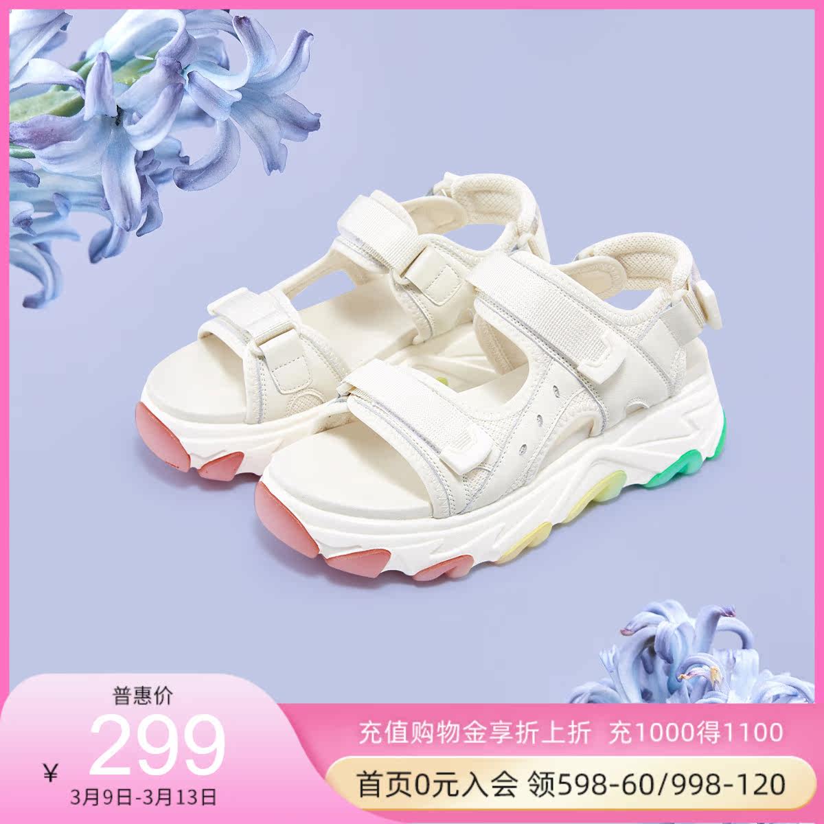哈森松糕凉鞋女厚底彩虹魔术贴百搭休闲女沙滩鞋 HM11918
