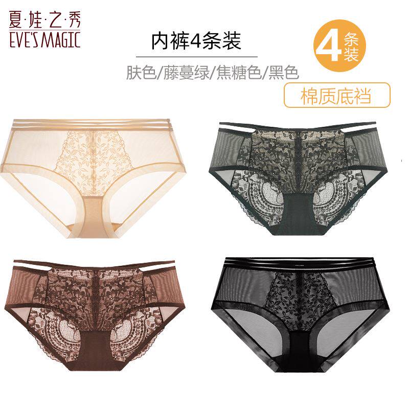 夏娃之秀4条装女士内裤舒适透气纯棉底裆三角裤性感蕾丝中腰短裤
