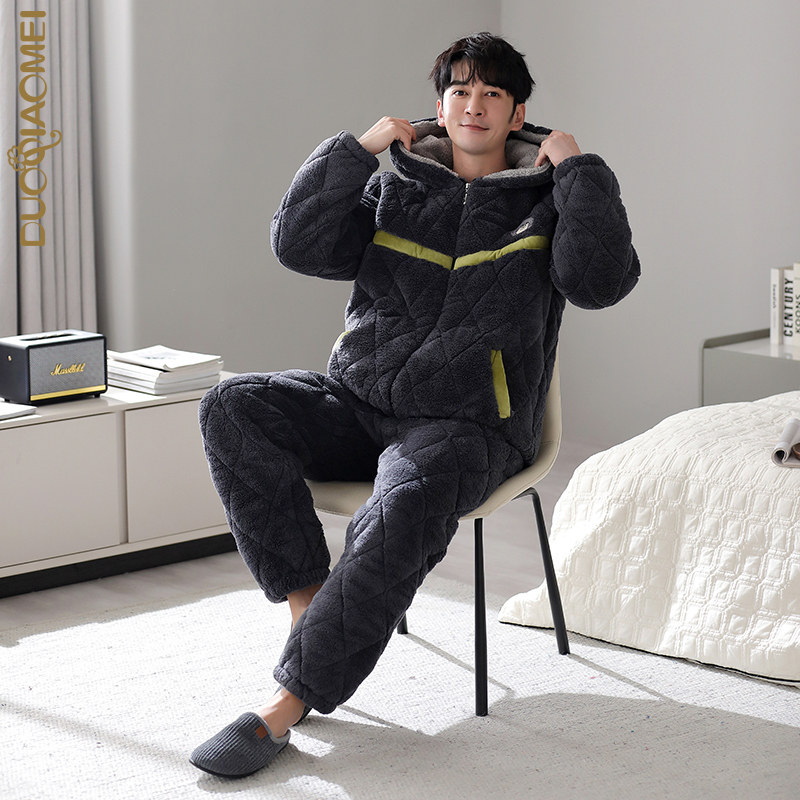 男士睡衣冬季加厚加绒珊瑚绒三层夹棉青年拉链保暖冬天家居服套装