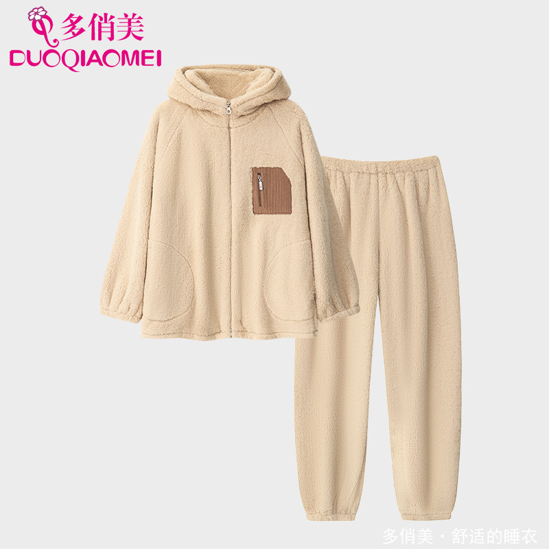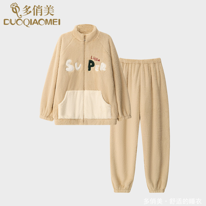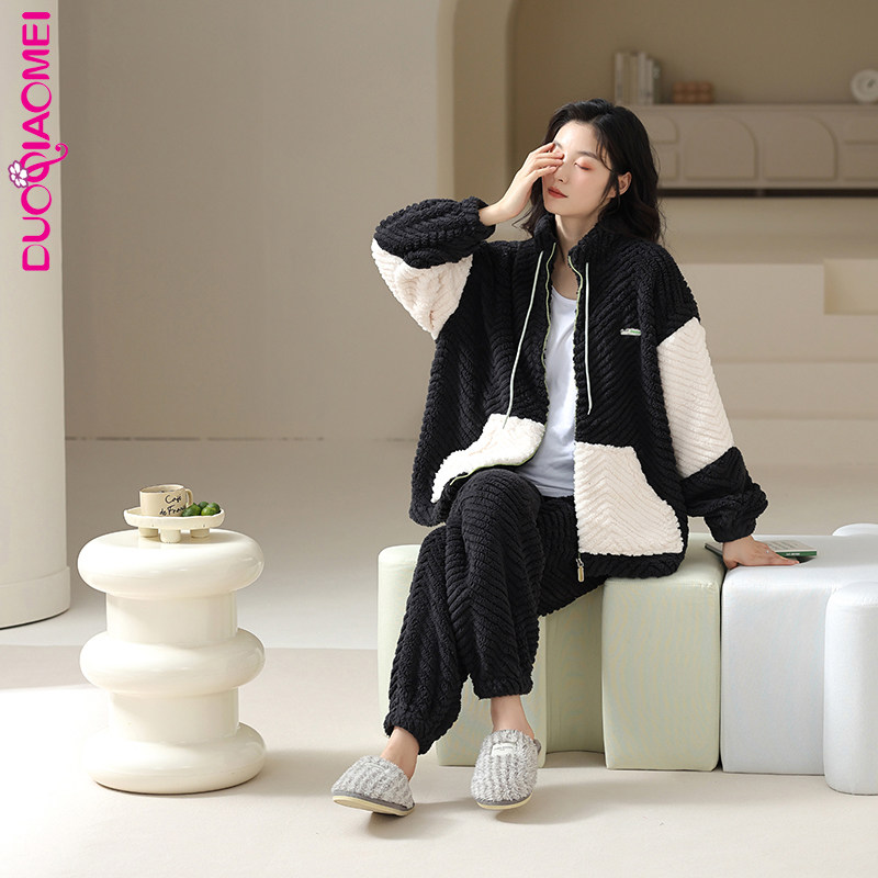 秋冬款珊瑚绒睡衣女加绒拉链高领可外穿冬季法兰绒女士家居服套装