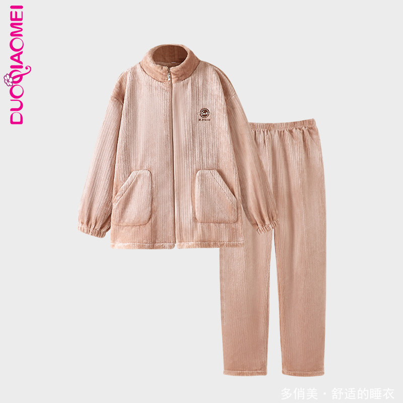 睡衣女士冬季珊瑚绒夹棉加厚加绒拉链家居服秋冬款套装2024年新款
