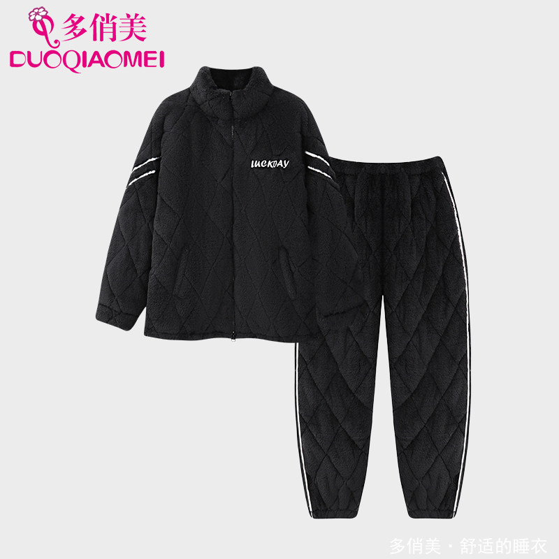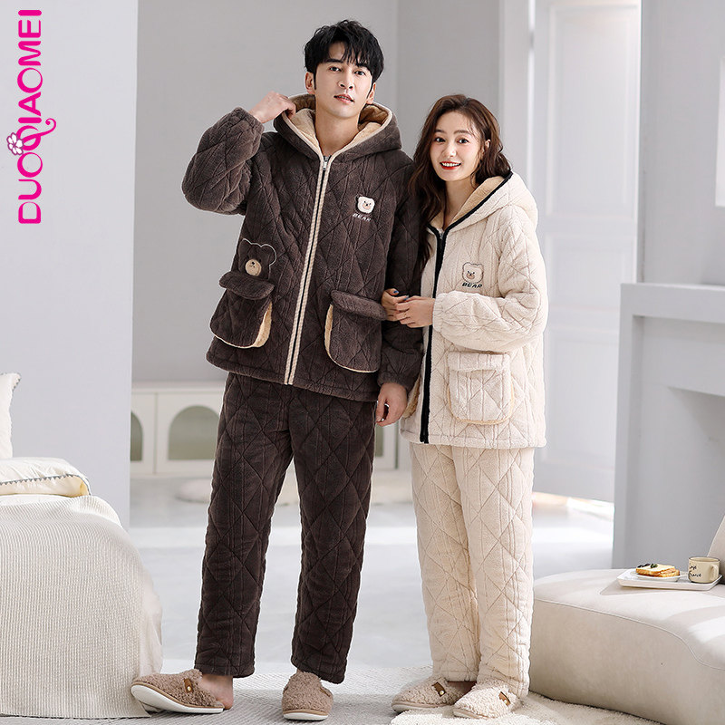 冬季情侣睡衣珊瑚绒三层夹棉加厚拉链法兰绒家居服男女款棉袄套装