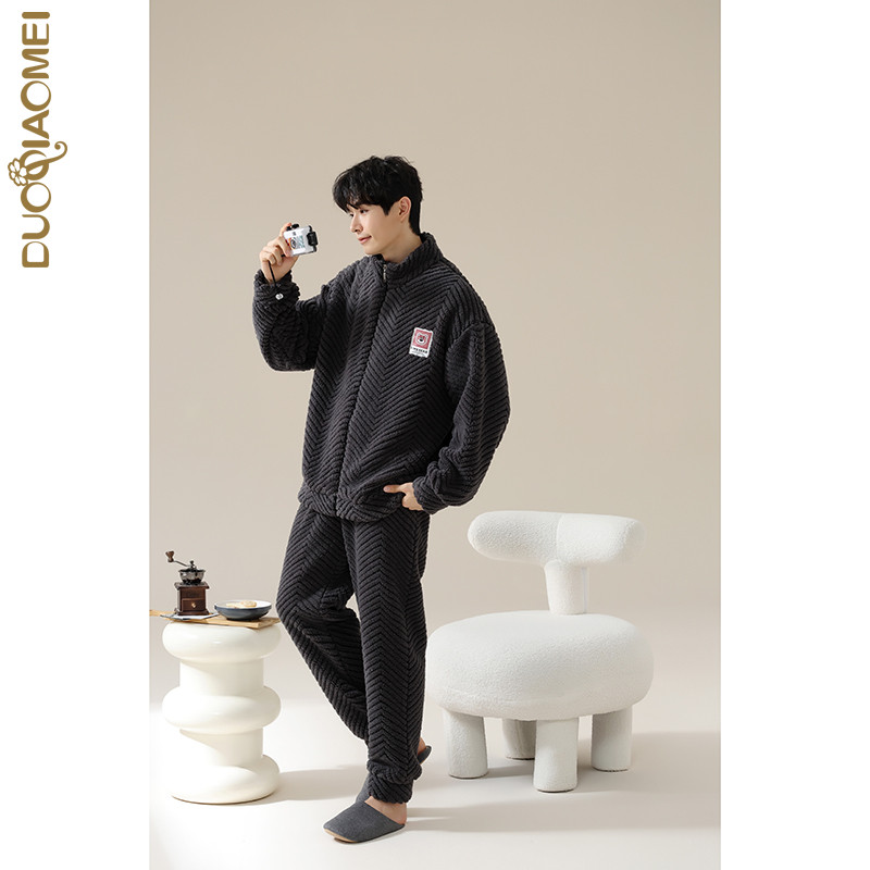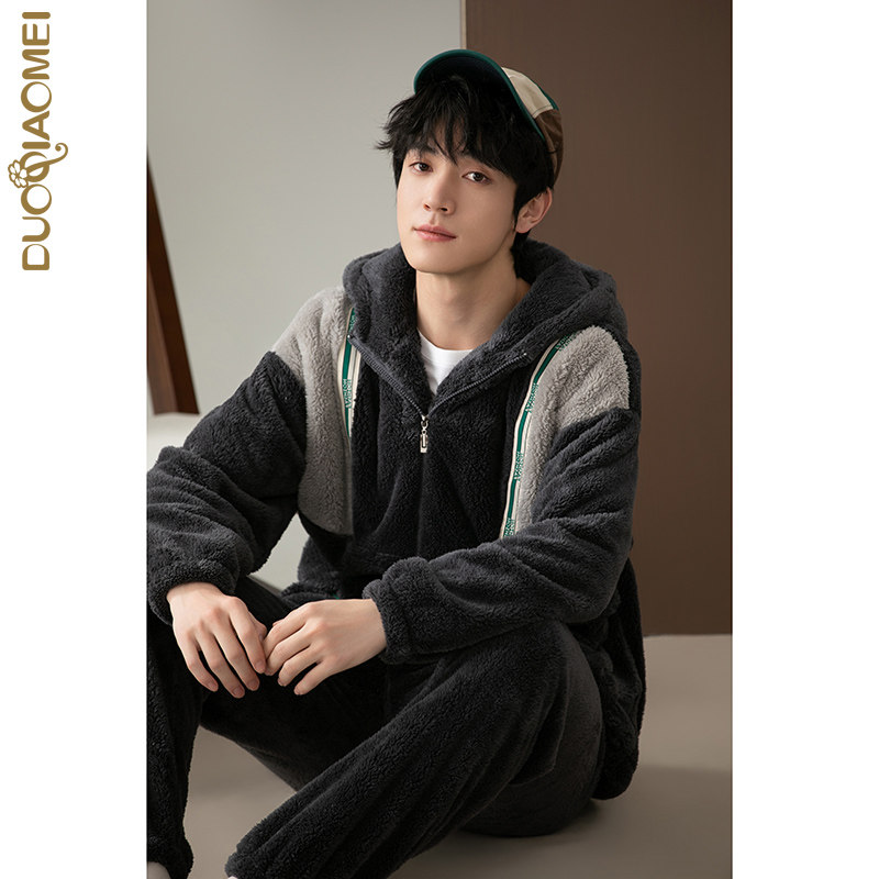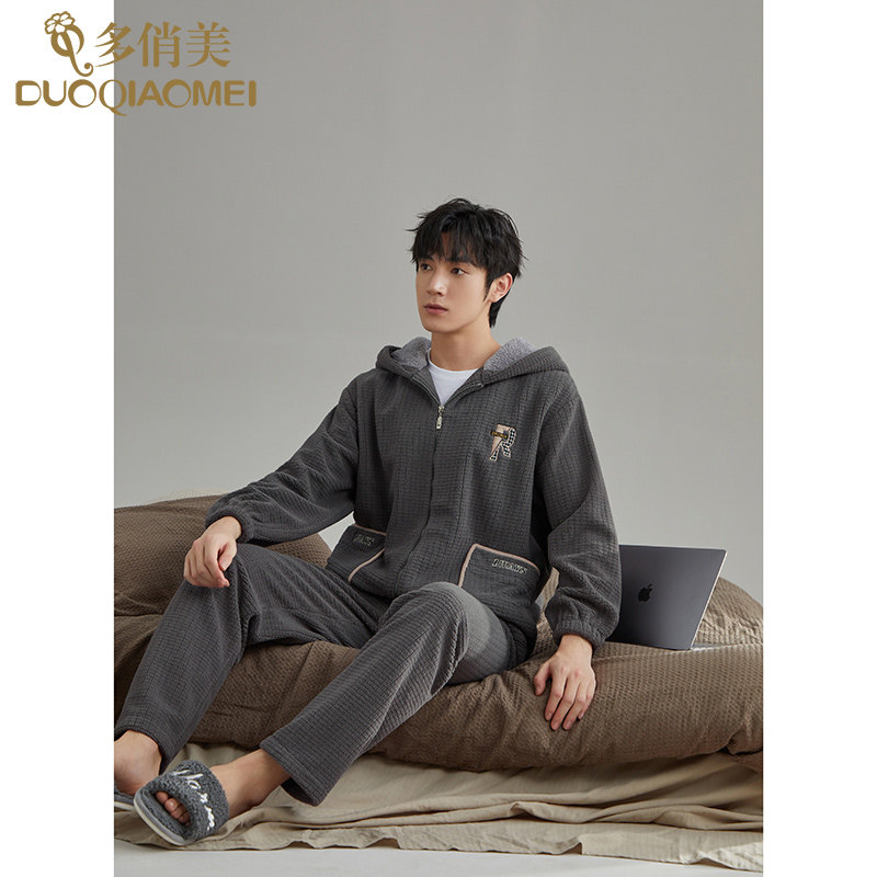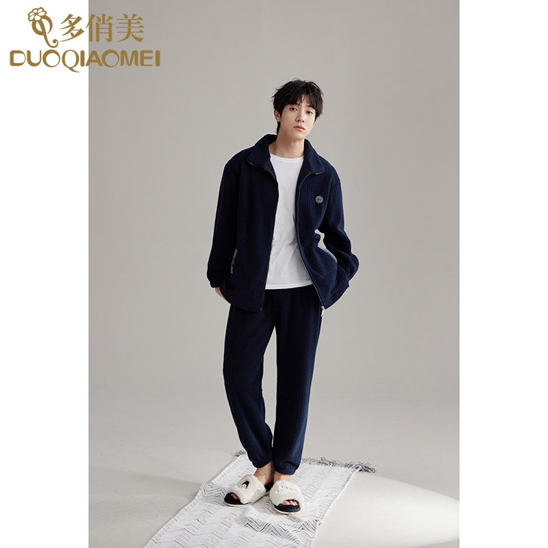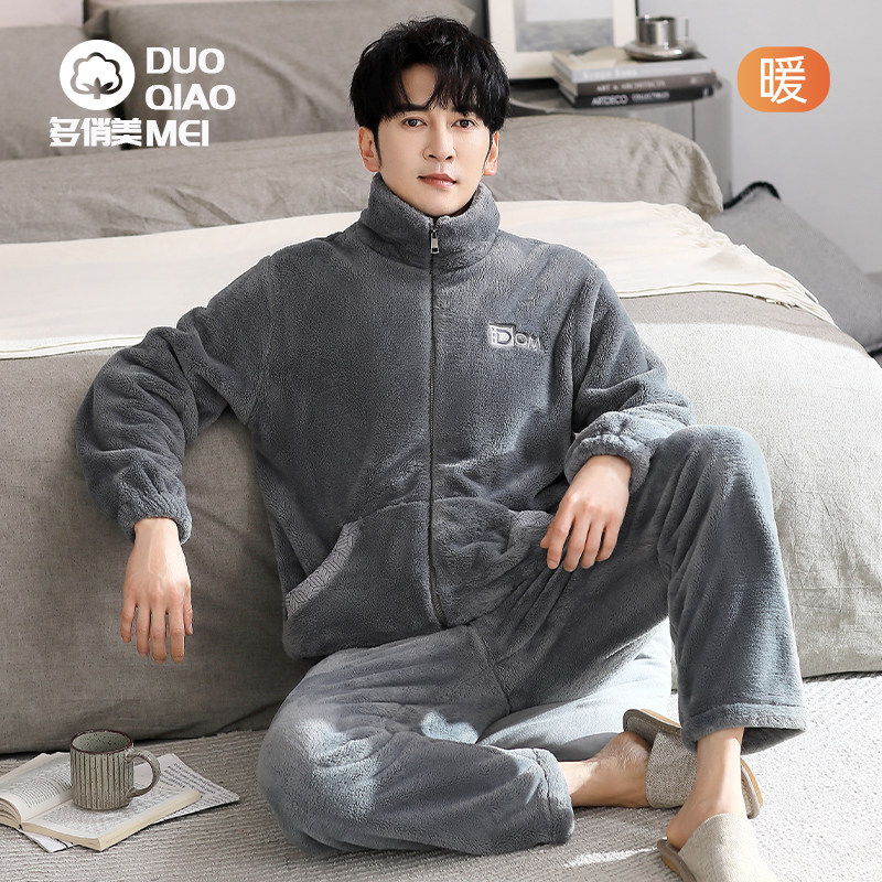 多俏美珊瑚绒睡衣男士冬季加厚加绒纯色拉链法兰绒男款家居服套装