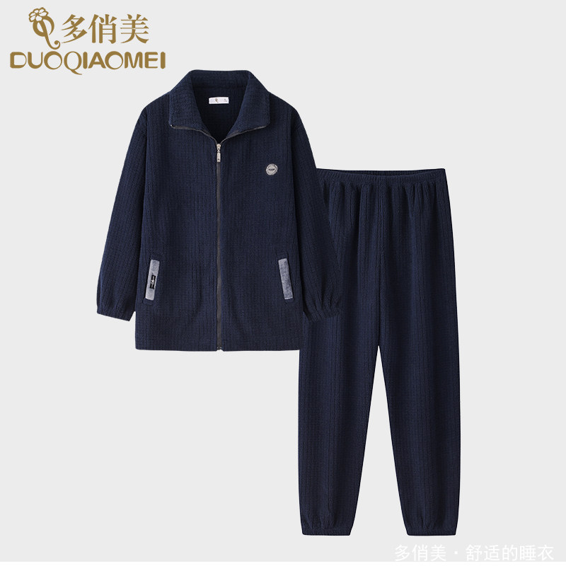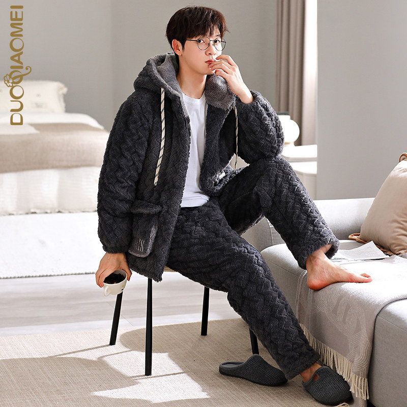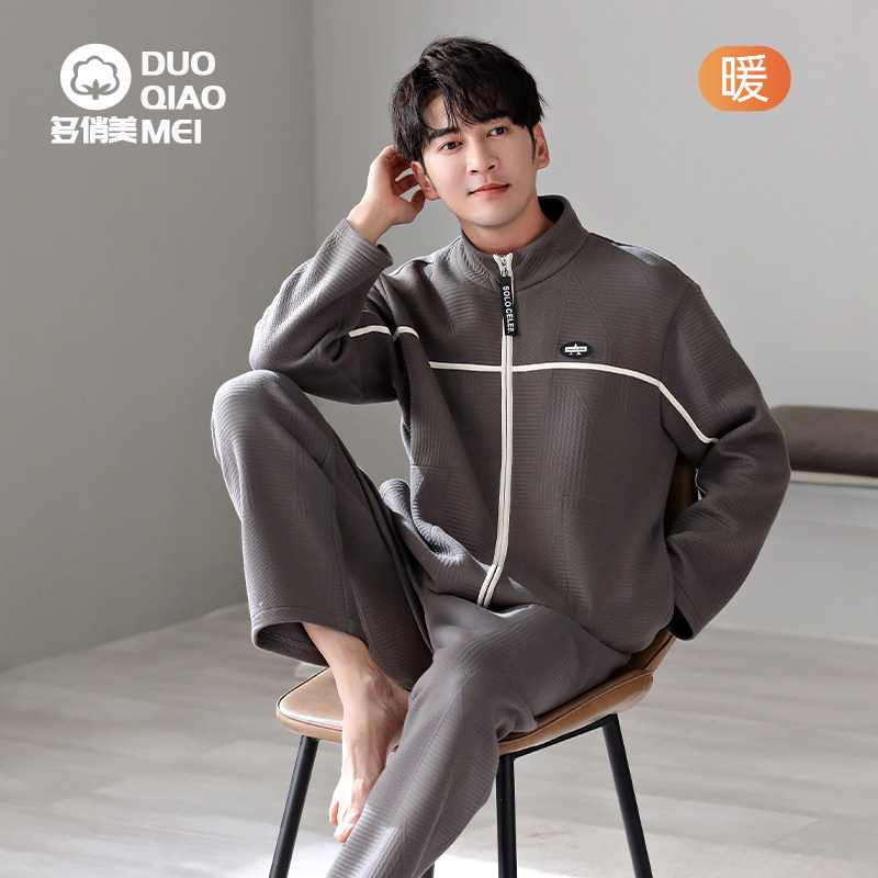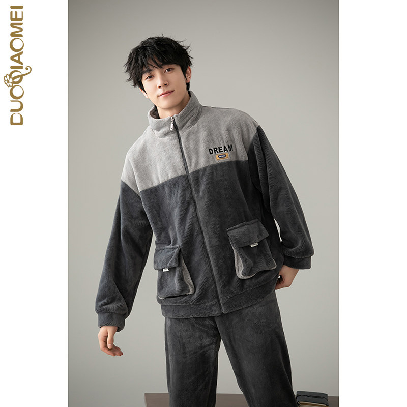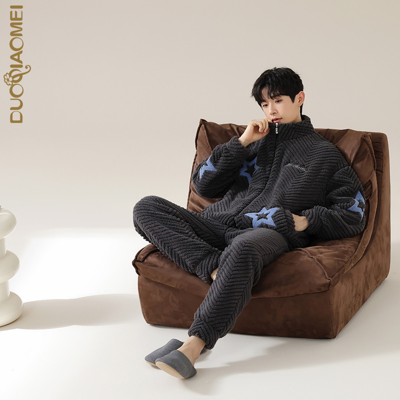 多俏美珊瑚绒睡衣男士冬季加厚加绒纯色拉链法兰绒男款家居服套装