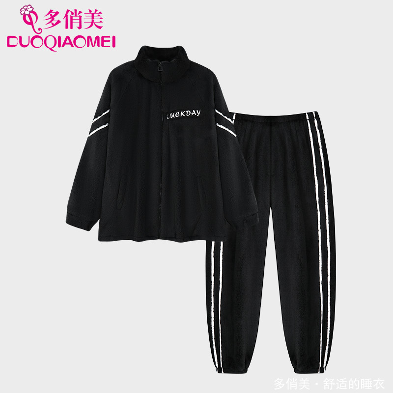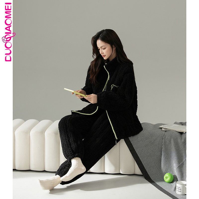 睡衣女冬季甜美可爱运动拉链立领珊瑚绒家居服黑色法兰绒秋冬套装