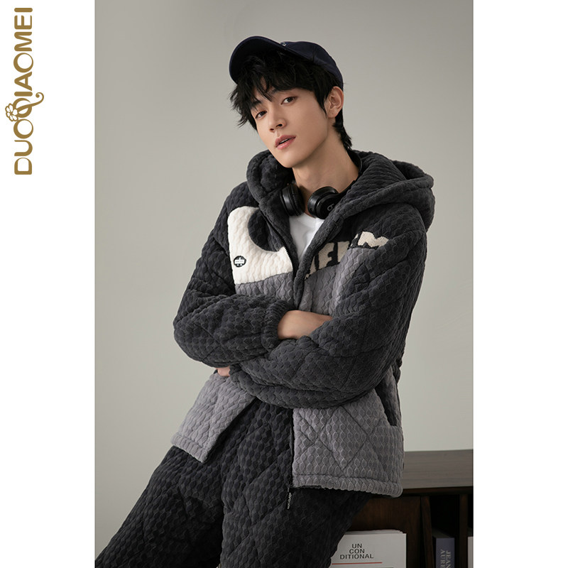 睡衣秋冬季男款珊瑚绒三层夹棉运动时尚简约拉链保暖家居服两件套