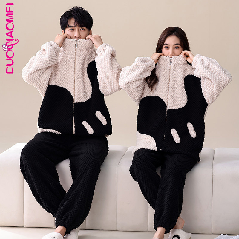 情侣睡衣冬季珊瑚绒加厚可爱拉链套装男女立领高领保暖外穿家居服