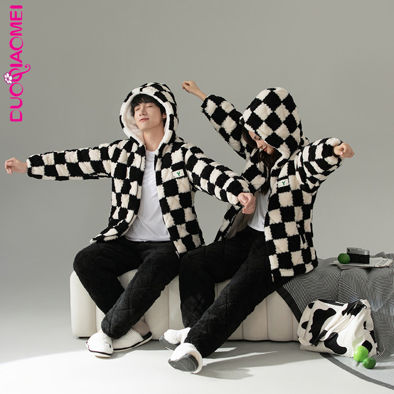 连帽拉链三层加厚夹棉情侣睡衣冬季女款珊瑚绒可外穿格子家居服男