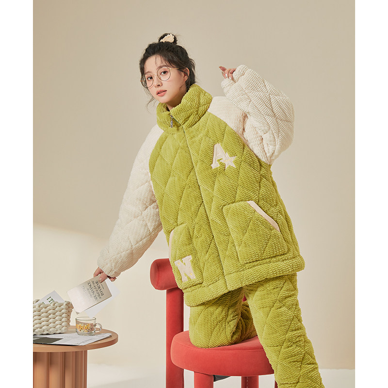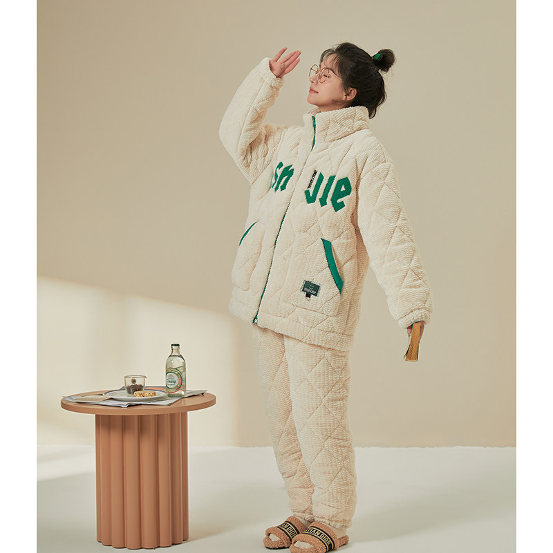 冬季女款睡衣加厚三层夹棉珊瑚绒保暖加绒开衫拉链立领家居服套装