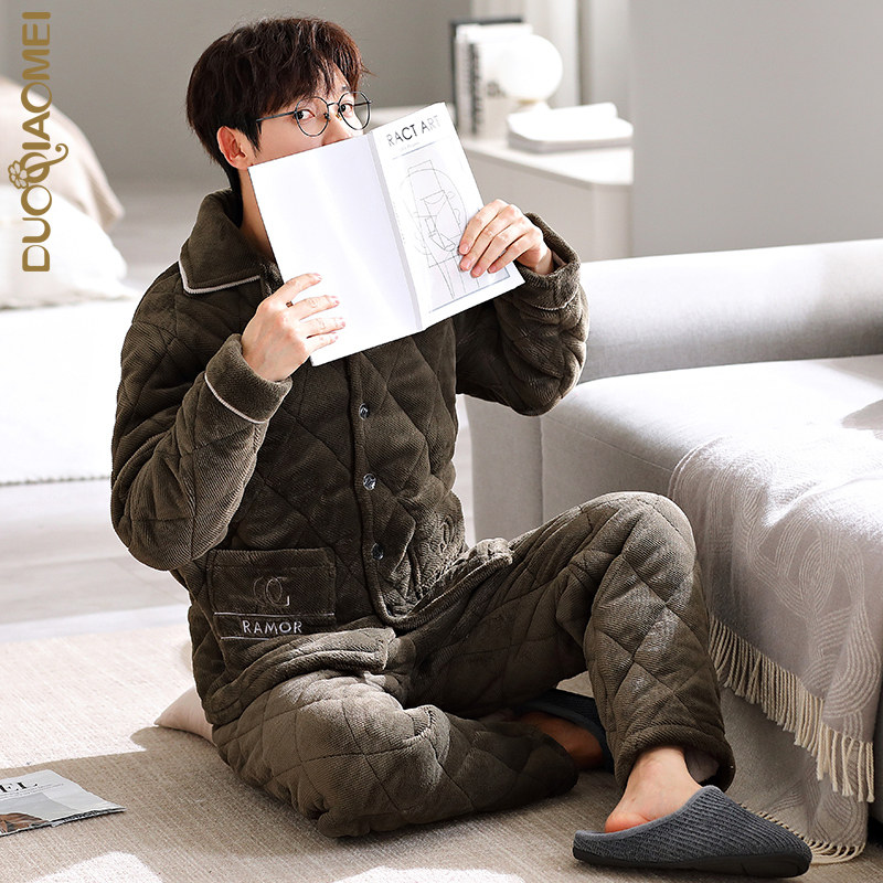 男士睡衣冬季三层加厚夹棉保暖拉链套装冬天男款珊瑚绒棉袄家居服