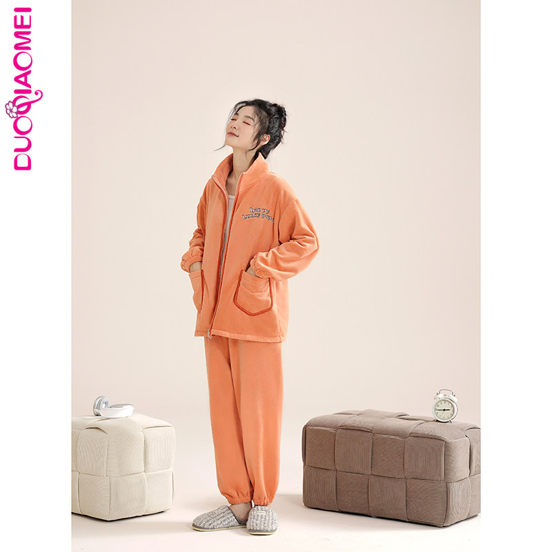 睡衣女士秋冬款珊瑚绒加厚加绒休闲拉链家居服女生法兰绒冬季套装