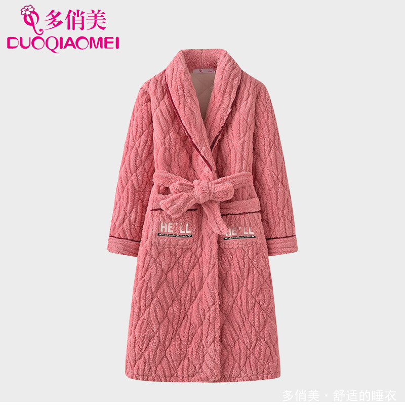 睡衣女冬季三层夹棉袄加绒加厚睡袍长款珊瑚绒保暖外套大衣家居服