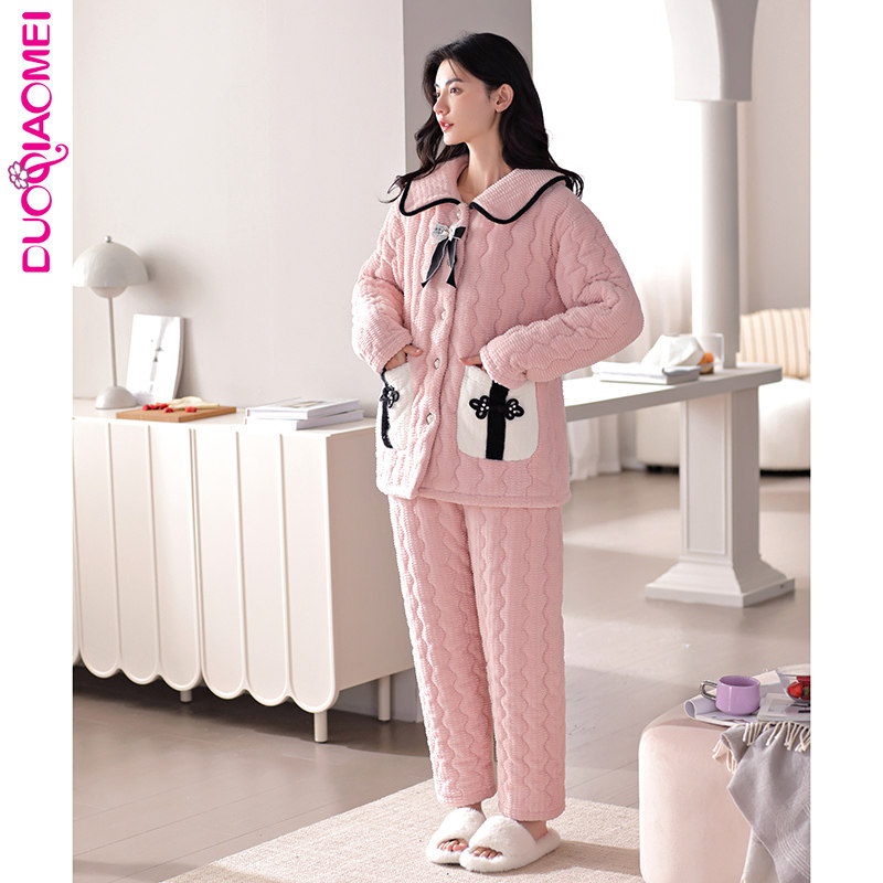 睡衣女冬珊瑚绒夹棉袄三层加厚加绒秋冬款可外穿保暖法兰绒家居服